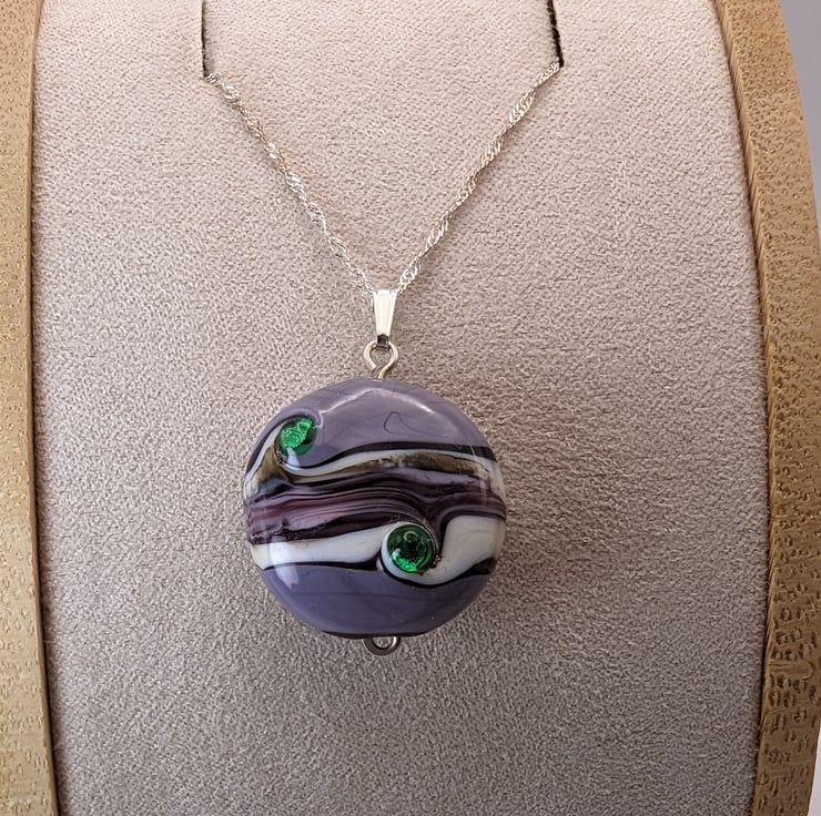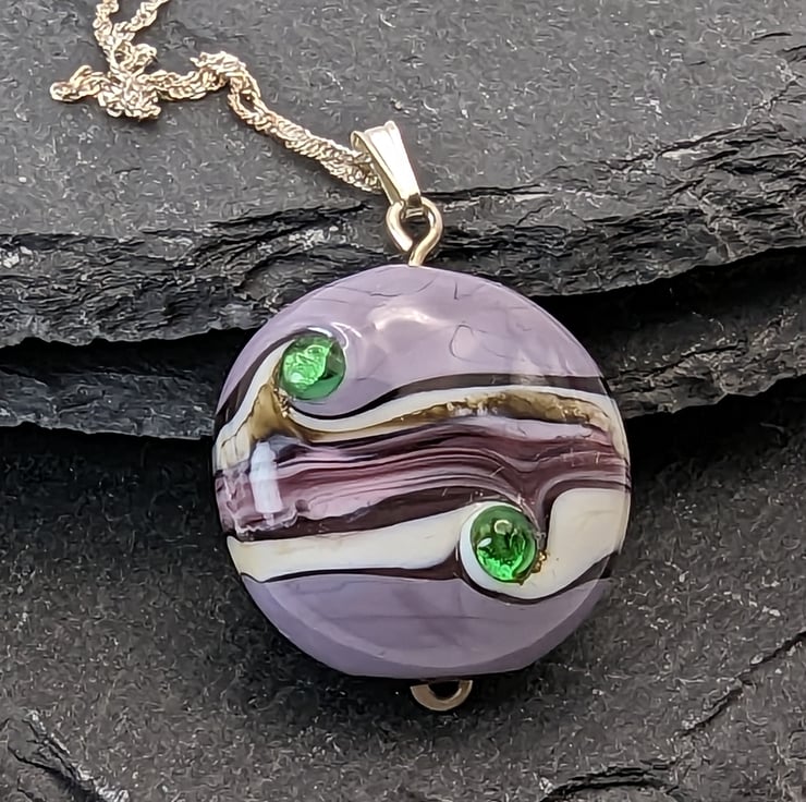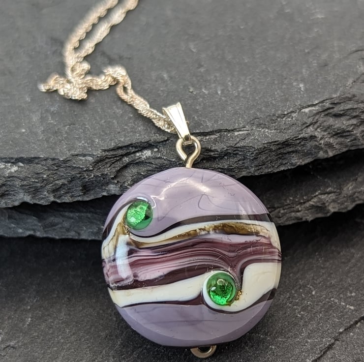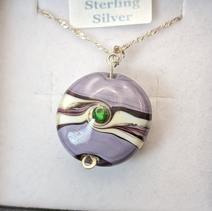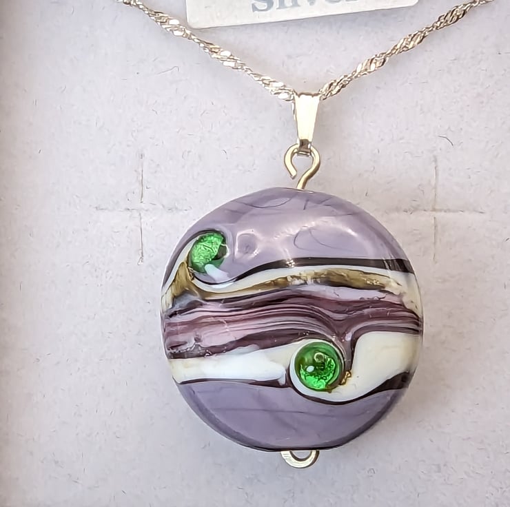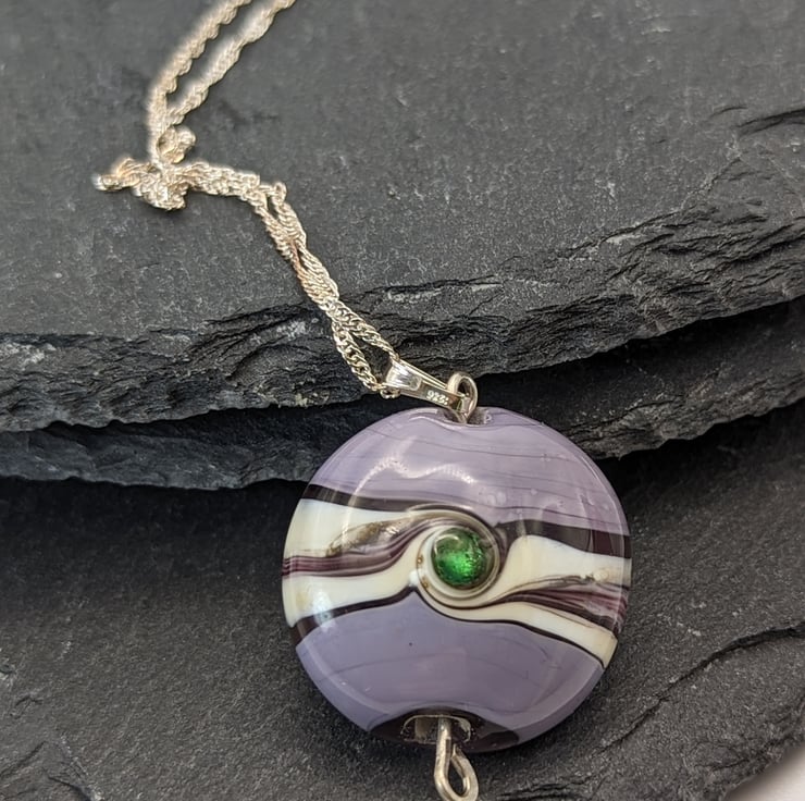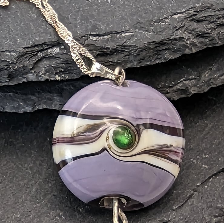 A bespoke lampwork pendant that is rich in purple hues. A purple and pink complex cane has been used to create a rippling pattern across the bead and a transparent green stringer coated with fine silver adds a gemstone effect. The lampwork bead starts life as simple glass rods that I melt in the flame and onto mandrels. I then add layers of glass and continue to melt and shape in the flame.