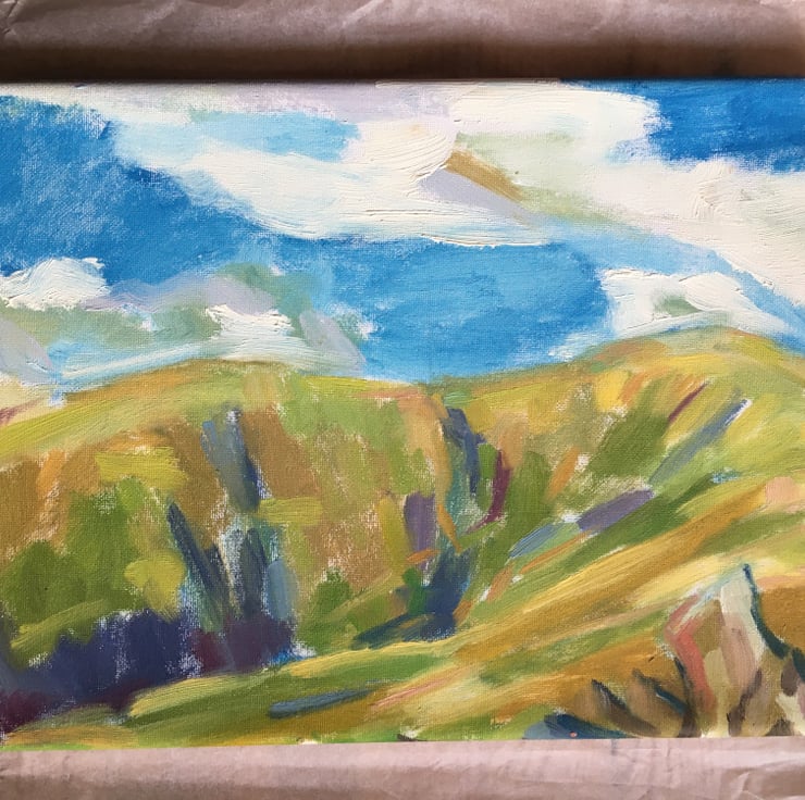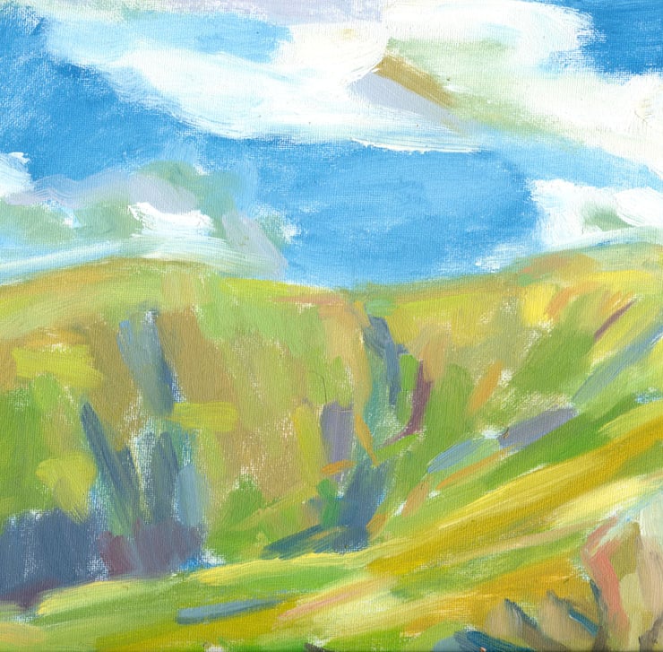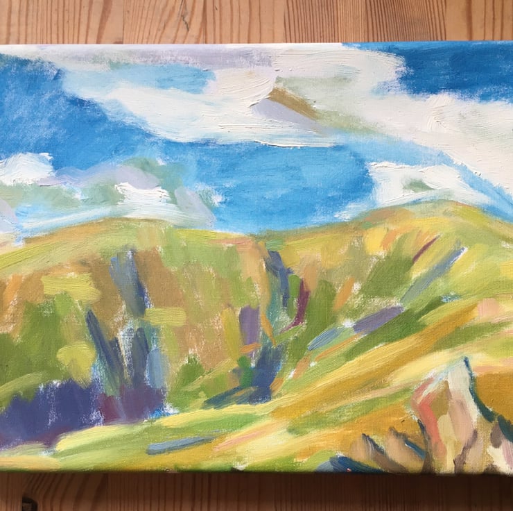 I painted many pictures in this hidden valley off the main walking routes in the Howgills and would often sit on the slopes with my painting kit until the last light. This was one such evening, at the end of a sunny day with just a few gentle clouds in the sky. The fascinating shapes and colours of the hilly ridge opposite kept me at work until it began to get chilly and the moon came out to tell me it was time to go.