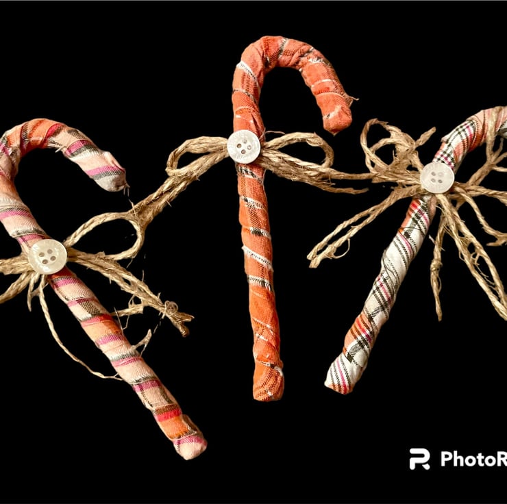 Pictured is a a sample of the fabric the candy canes are made from and your set may look slightly different depending on the section of the plaid fabric used.