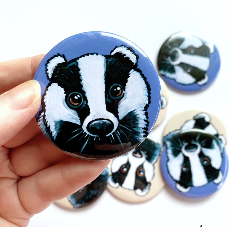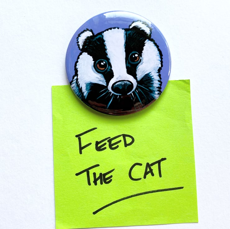 A large badger fridge magnet featuring an illustration by UK artist Lisa Marie Robinson.