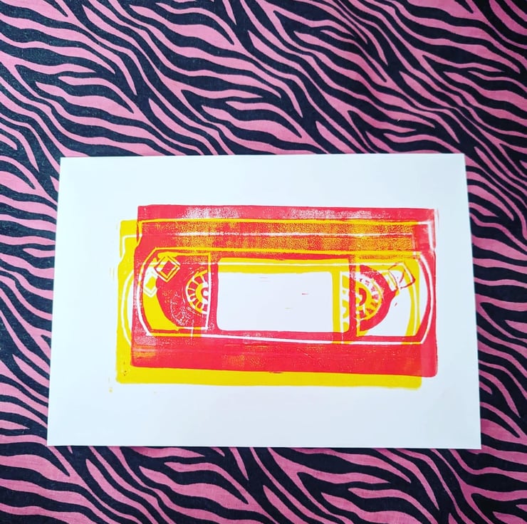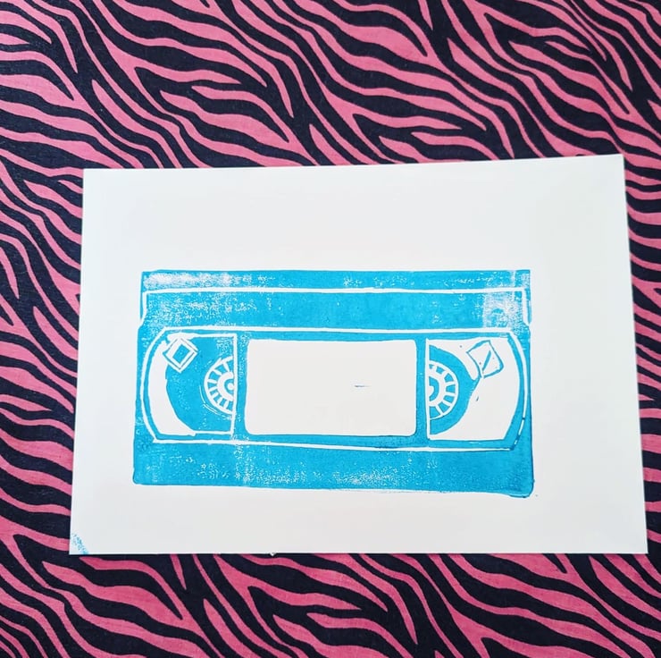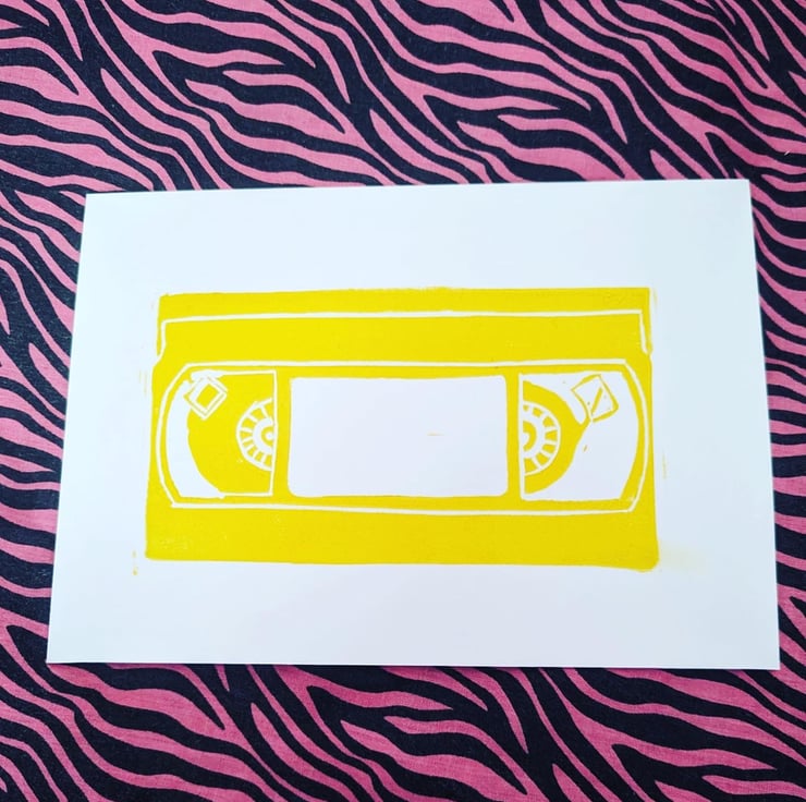 A5 VHS lino print hand drawn and hand carved to add a little bit of nostalgia to your room. Pick from either one colour or two. Specify in the notes colour quantity and preference.