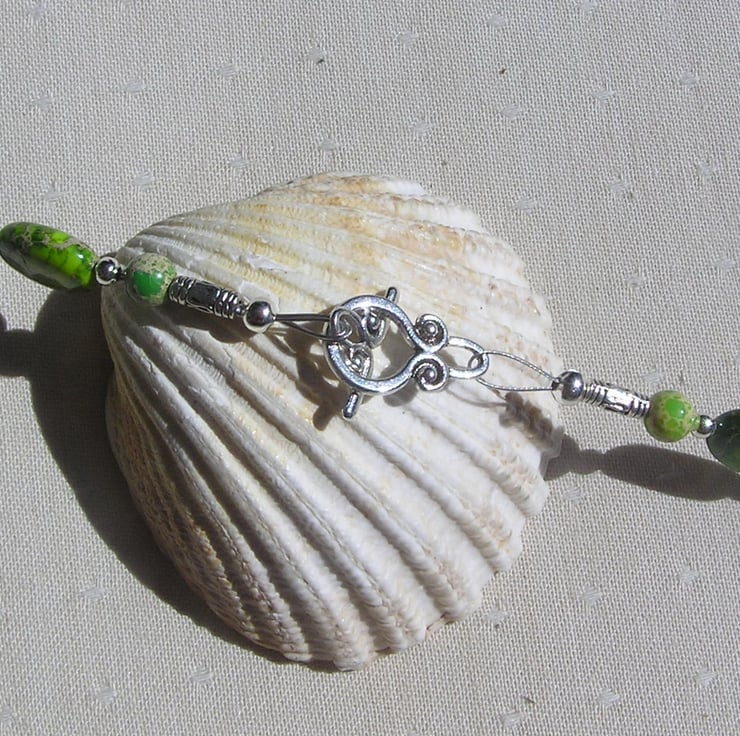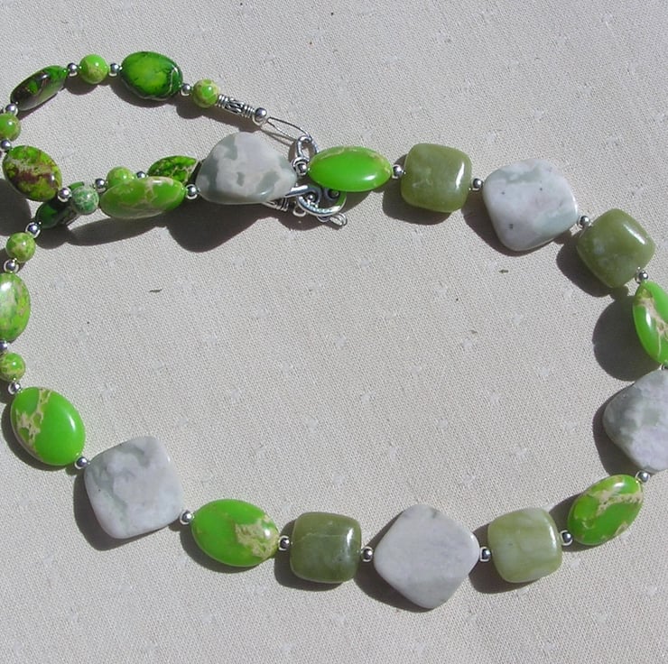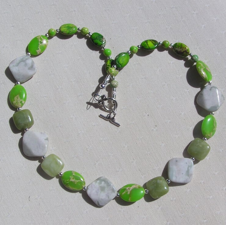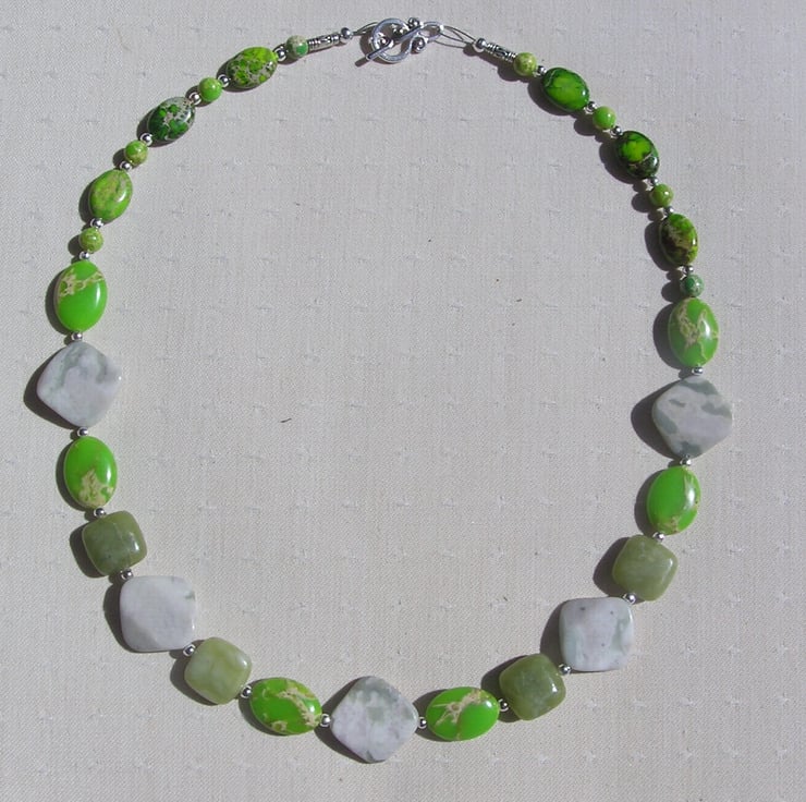 This Stunning Necklace is made wholly from Green Beads... Sea Sediment Jasper - oval & round beads teamed with Peace Jade - dreamy marbled diamond shaped beads and Green Jade square beads, each separated by a sparkling tiny Silver spacer beads - a marvellous Celebration of the colour Green that will look stunning either worn casually or with something more Elegant for a Special Evening out