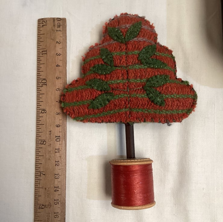 A cute little hand made tree, standing proudly on a vintage cotton reel.