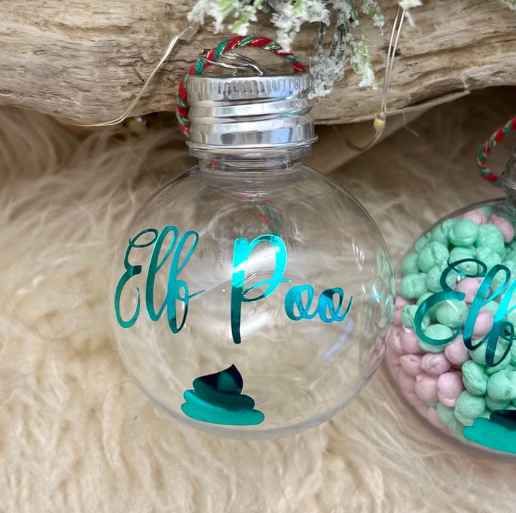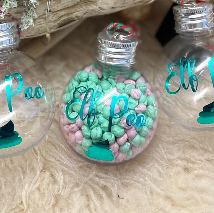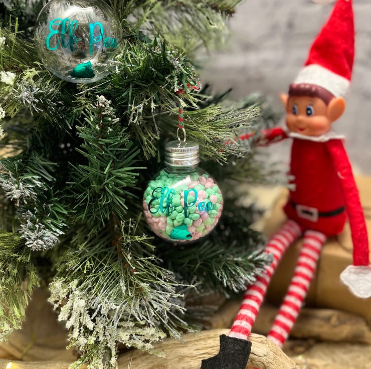These fun baubles will be an absolute hit this Christmas. Filled with tasty elf poo (strawberry and apple 'millions'...shhh!) they make for a fun, cheeky and tasty Christmas gift/treat and or decoration! They would go great with an elf on the shelf, children will love seeing what their naughty elf has been up to over night it will be sure to bring some laughs! Or perhaps in a Christmas Eve box, stocking filler or as party favour or table decoration.