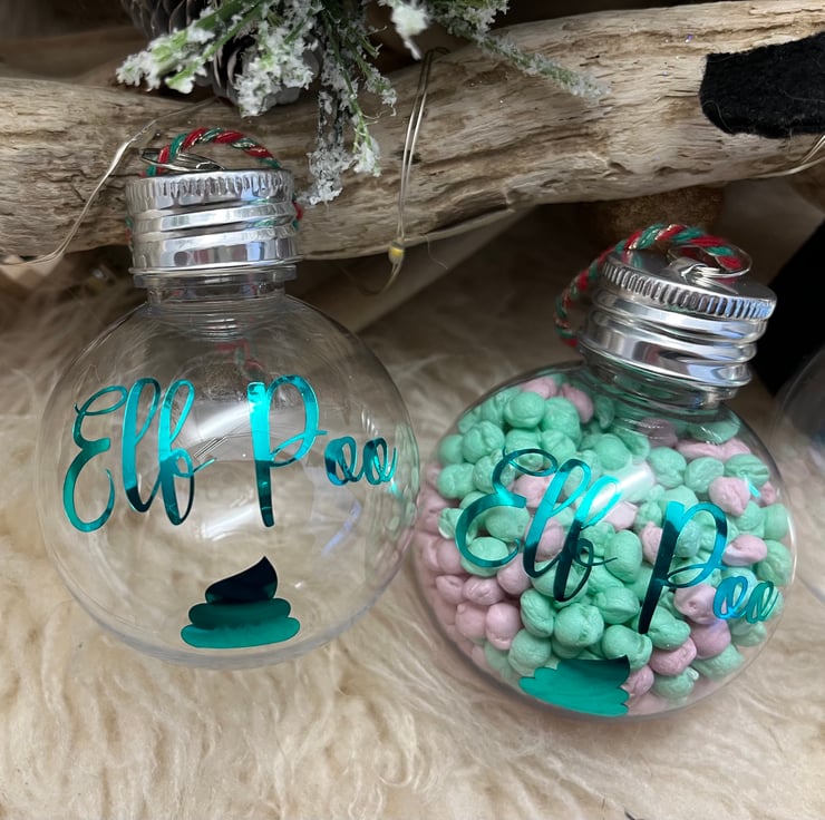 These baubles are made from food safe plastic (no glass) so they are safe and shatterproof, the super shiny reflective green vinyl reads 'elf poo', finished with red and green twine. They can stand alone on a surface due to their handy flat bottom and the lid easily unscrews