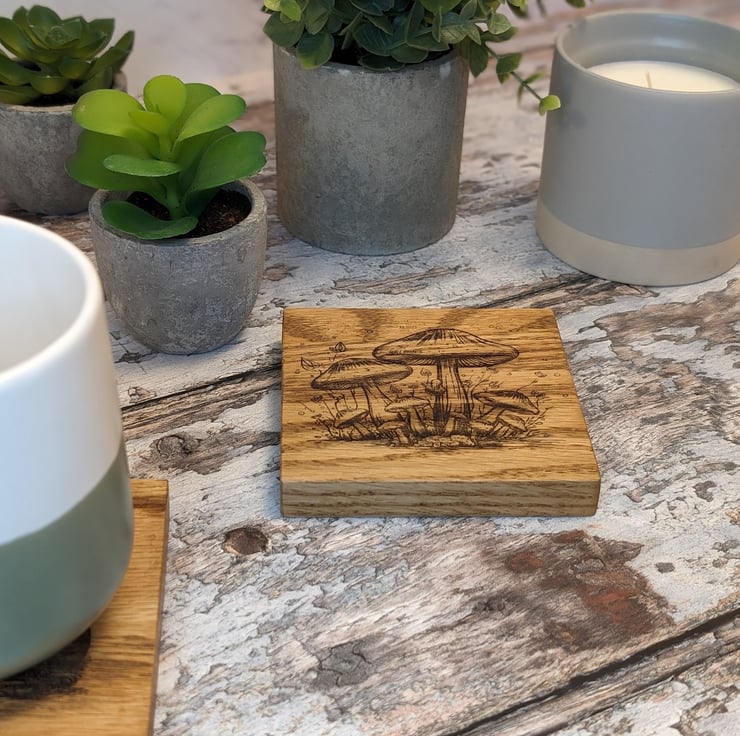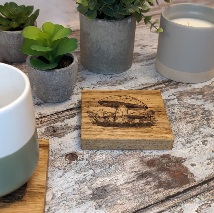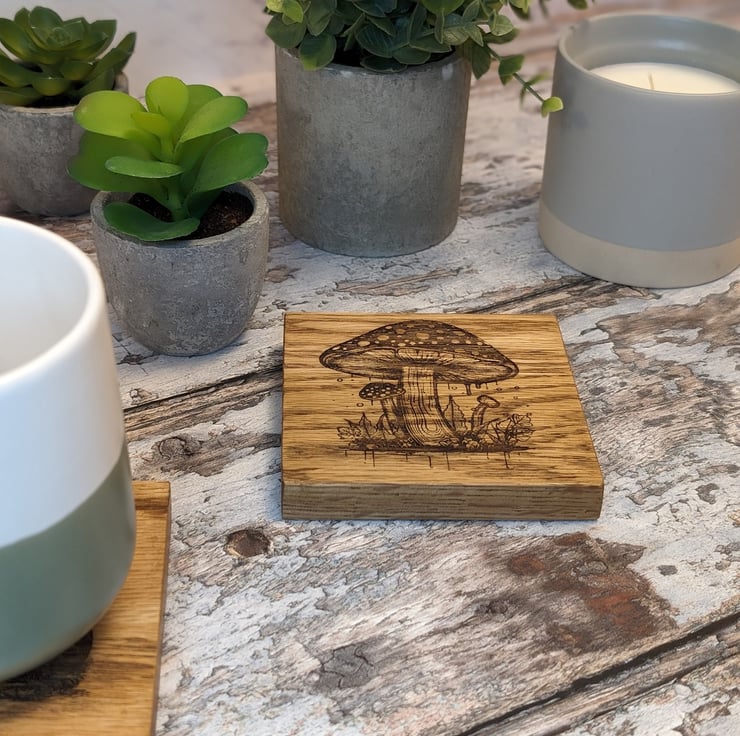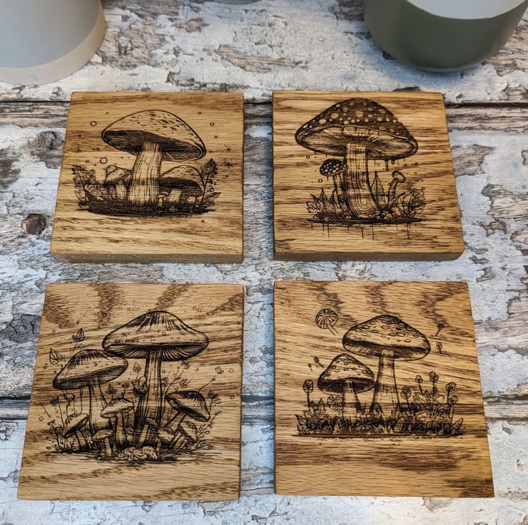 Set of 4 coasters each engraved with a different image of a Toadstool. Made from solid oak wood these coasters are a perfect addition to any country kitchen or coffee table.