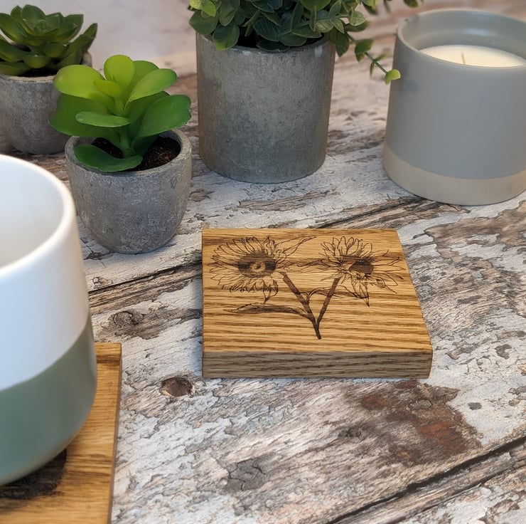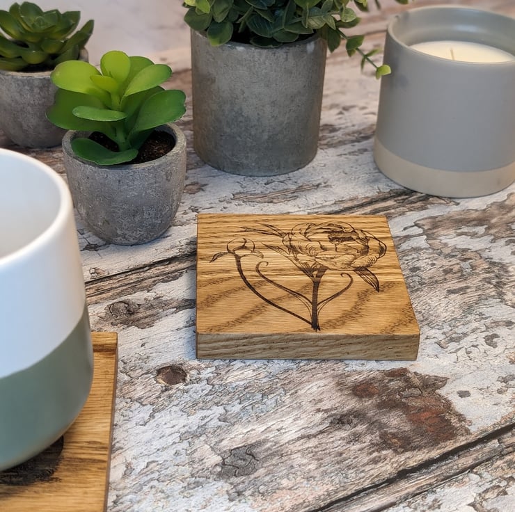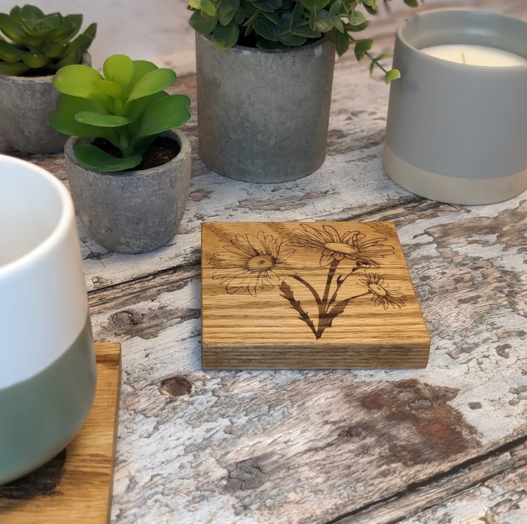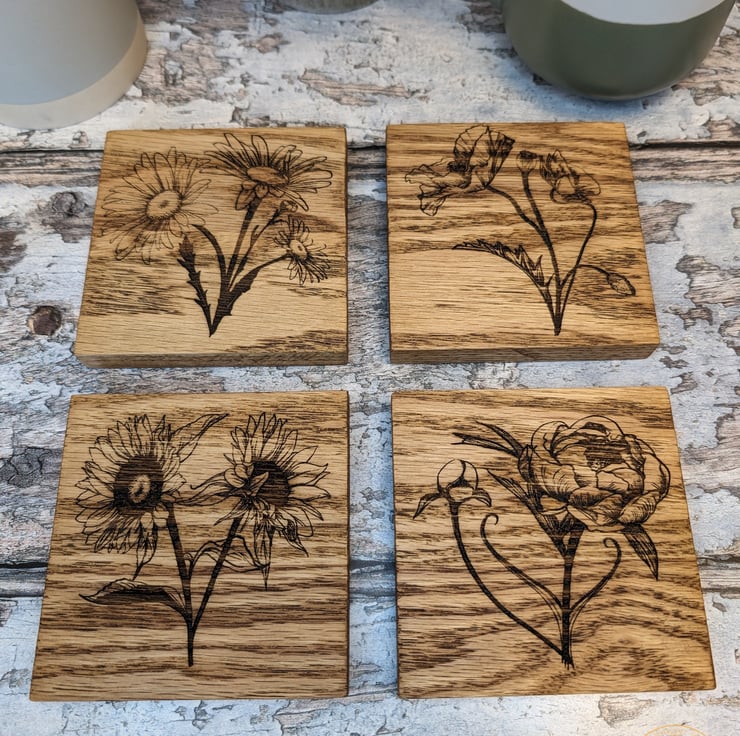 Set of 4 coasters each engraved with a different image of a Flower. Made from solid oak wood these coasters are a perfect addition to any country kitchen or coffee table.