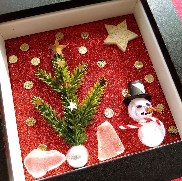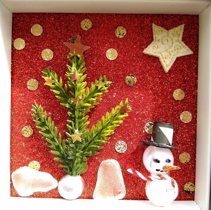 Every element in the frame has been upcycled from the punched out snowflakes to the sea glass snow drifts, all set against a super-sparkly red background.