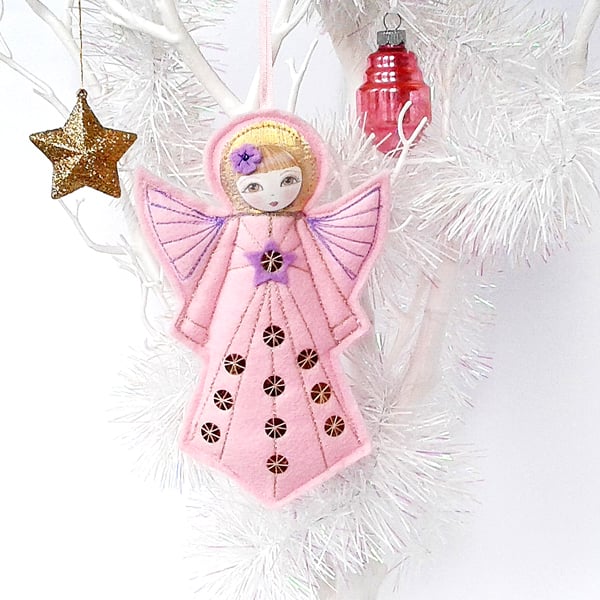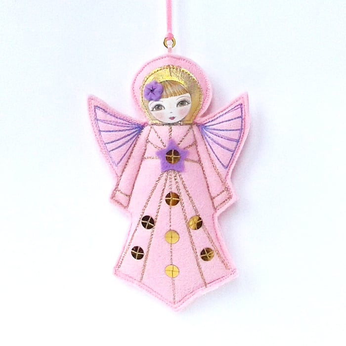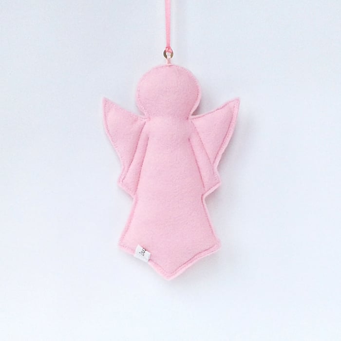 This little pink felt angel ornament hangs from a pink ribbon and makes a very cute gift for a loved one or keepsake for yourself. It looks lovely displayed in the home, office or workroom all year round, not just at Christmas.