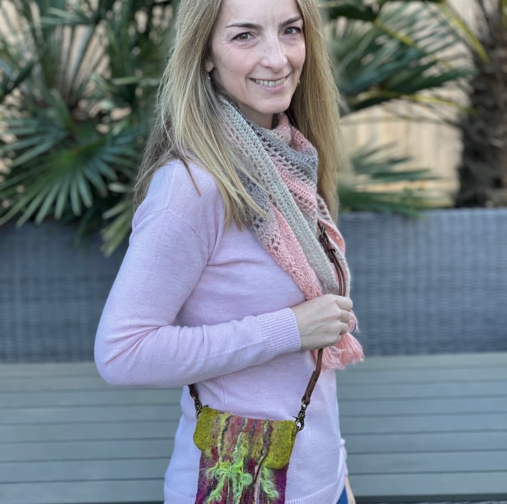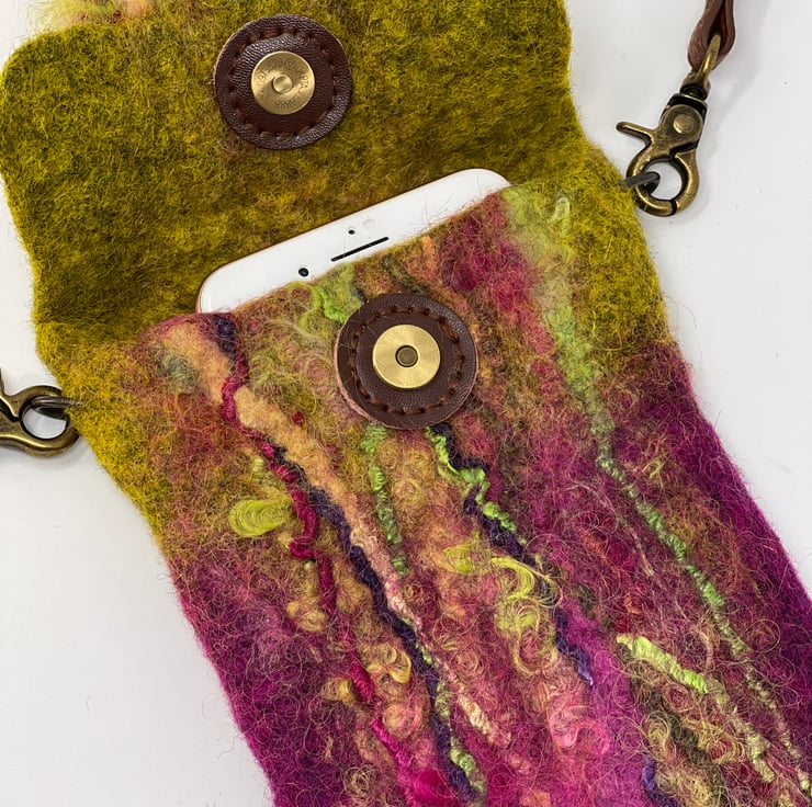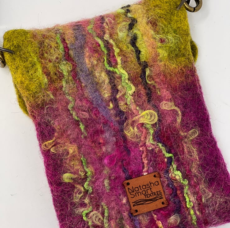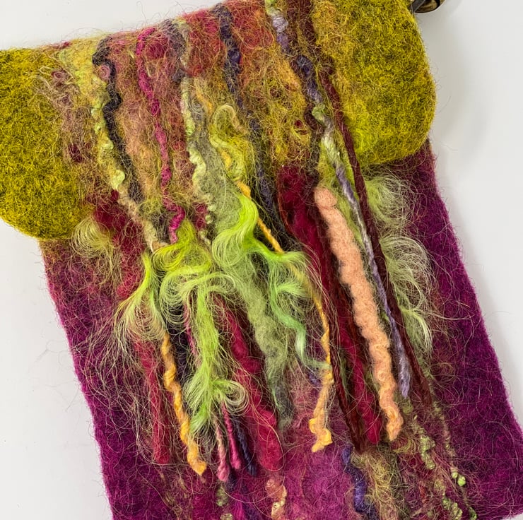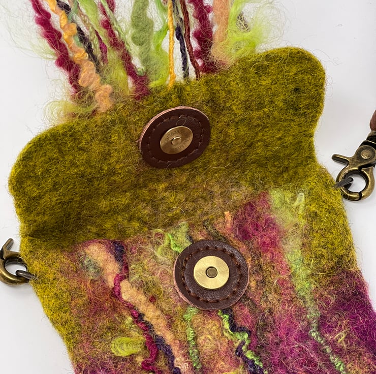 This small bag has been wet felted by me, using wool fibre around a resist to create a shaped, seamless, flat bag in green and deep pink colours. I've used a variety of wool and bamboo mix yarns and long curly wool locks to create the outer decoration, and added a leather-backed magnetic clasp fastener to the flap as a closure. It has a long, detachable brown faux leather strap, which is 12mm/0.5" wide and has an adjustable length of 104cm-114cm (41"-45").