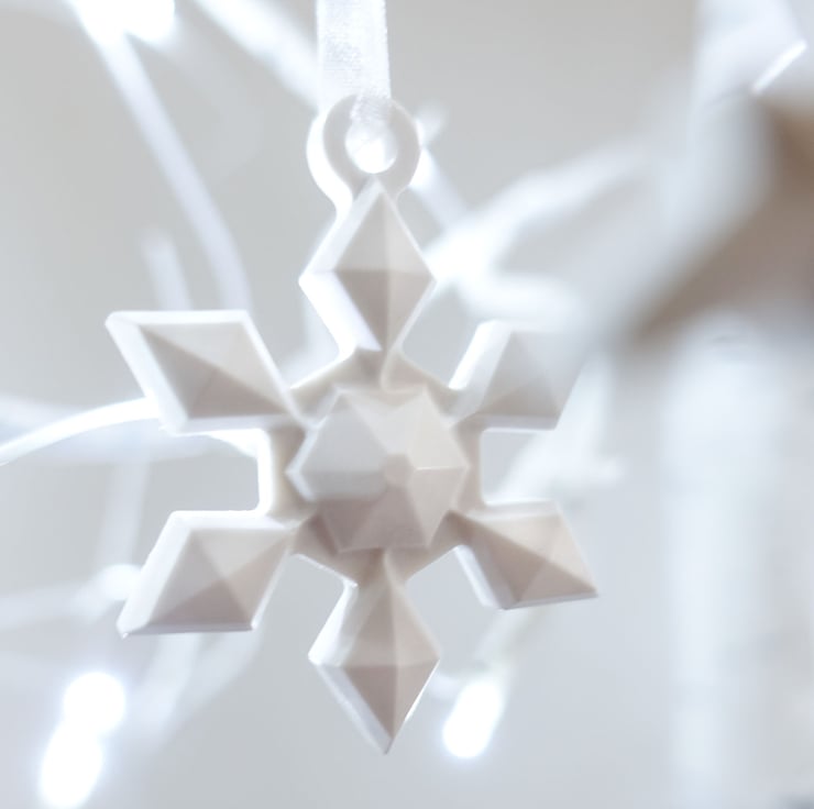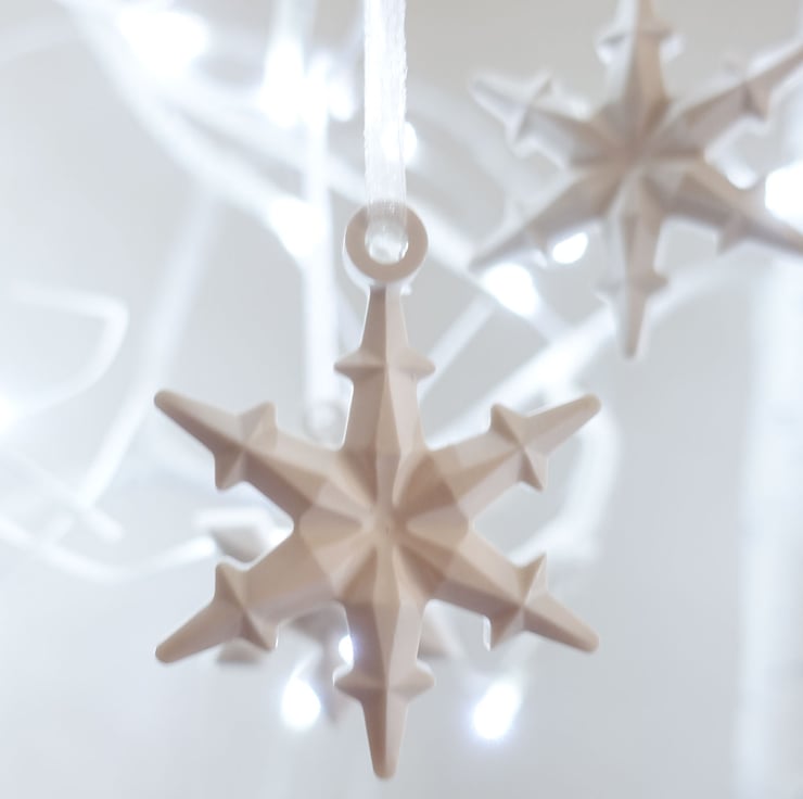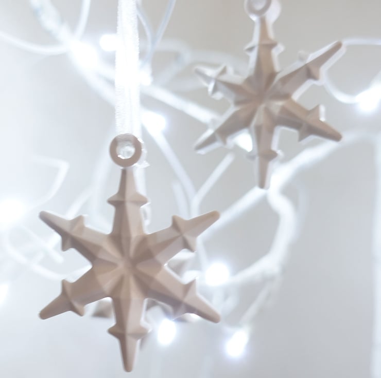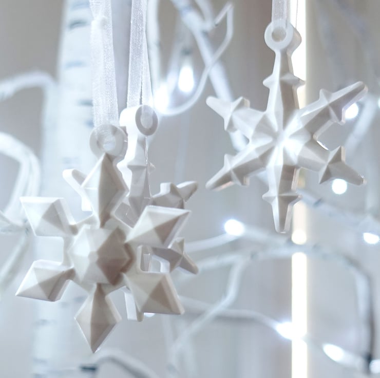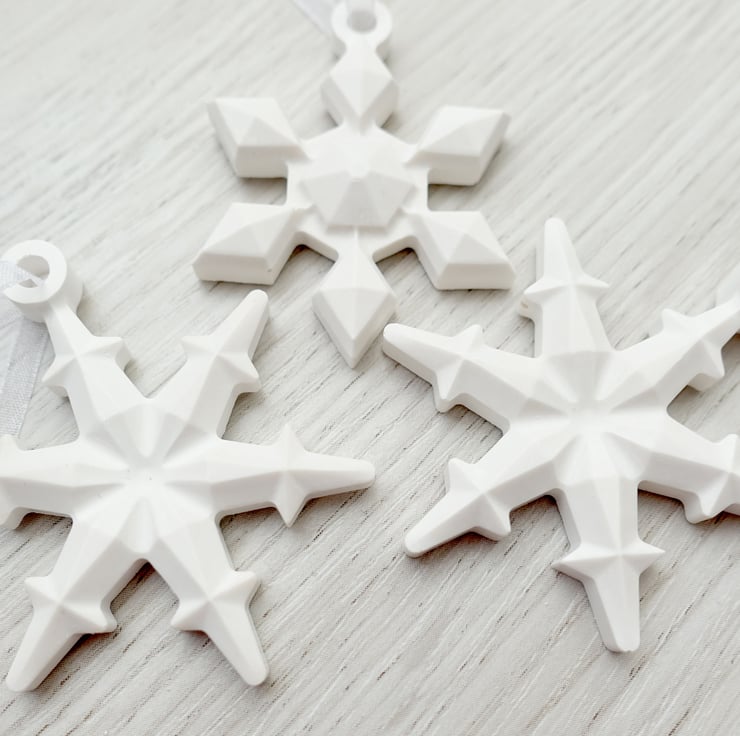 This trio of gypsum white snowflakes are used to hang on your tree if you want to recapture the natural fresh pine scent of a real Christmas Tree. Each snowflake hangs from a 3mm taffeta white ribbon.