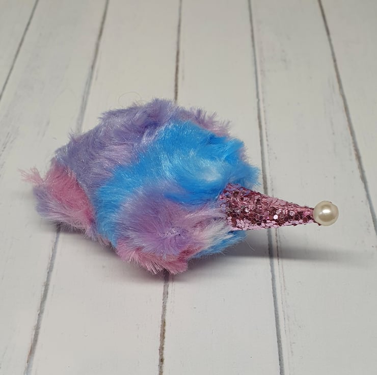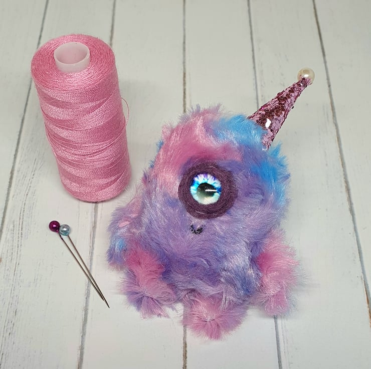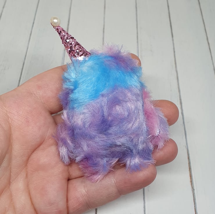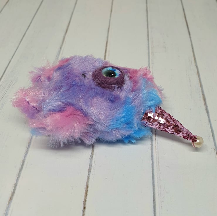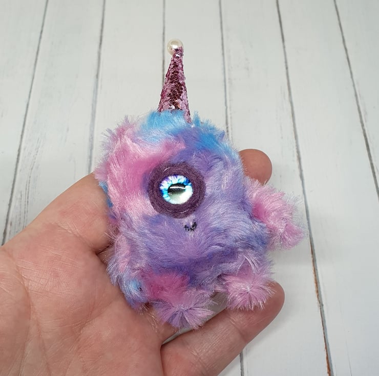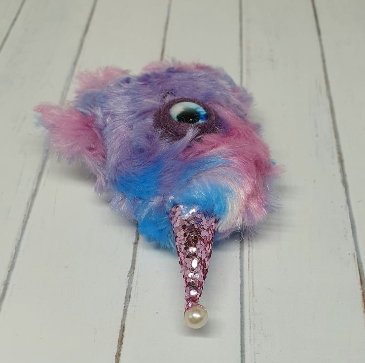 Soft Faux fur monster with one glass eye in felt surround. This little monster measures roughly 9cm tall and wears a hand sewn glitter hat with pearl on top. The smile is hand embroidered. The hat is sewn to the head and the monster comes with a transparent loop hanger.