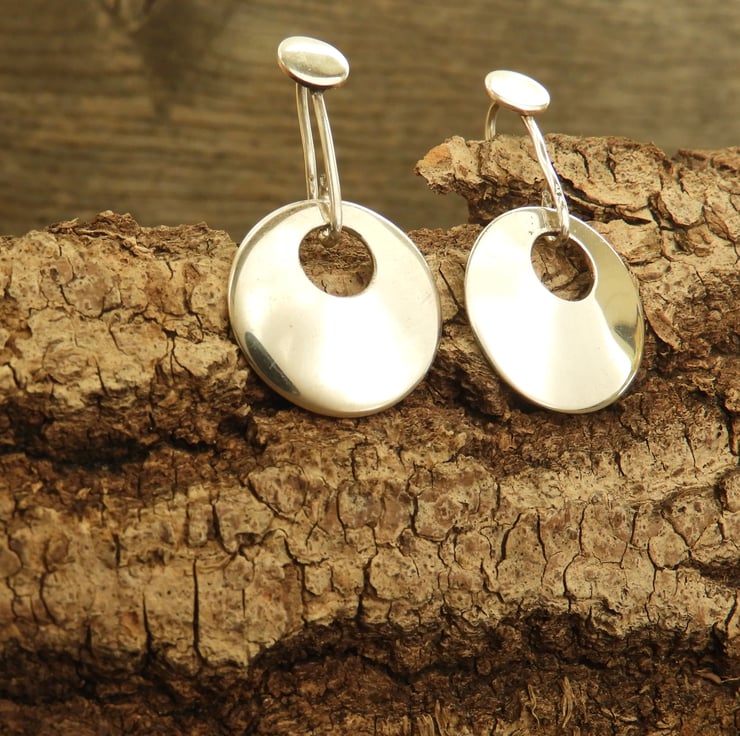 Symbolising wholeness, unity and eternal love, these smooth circular drop earrings are the height of sophistication. Suspended from one continuous piece of silver wire, the centre of the circle sits on the earlobe while the main circle dangles underneath.