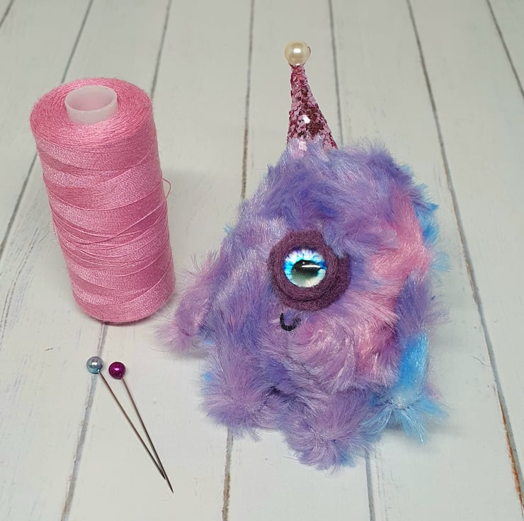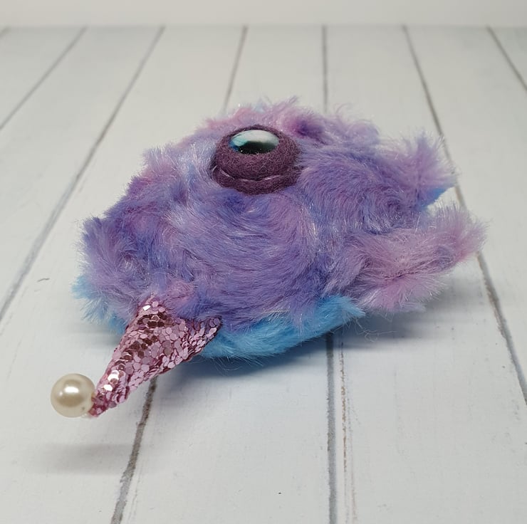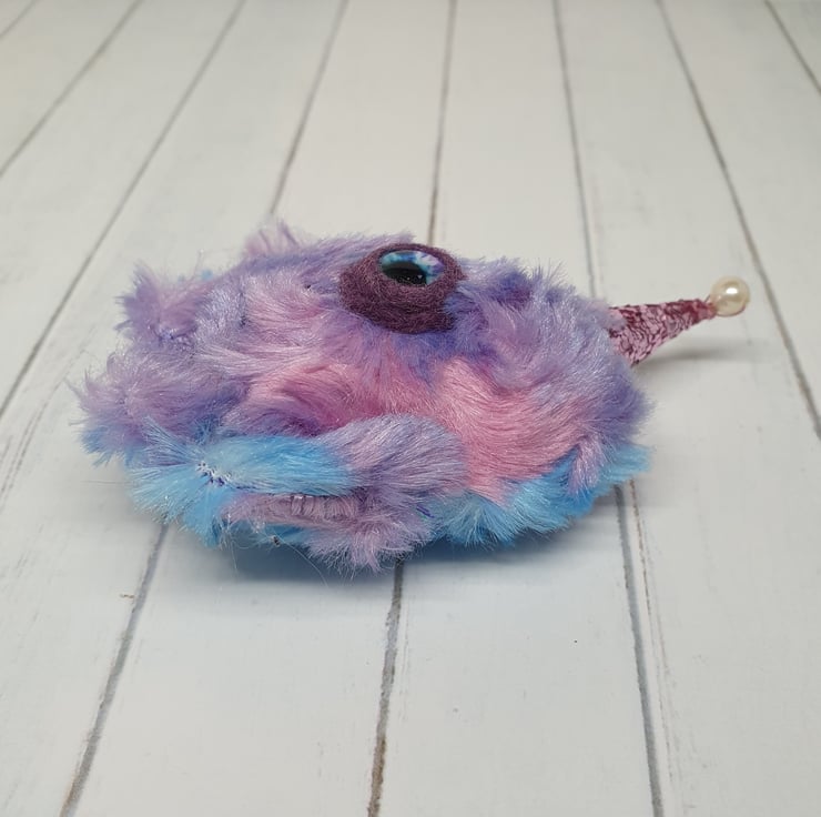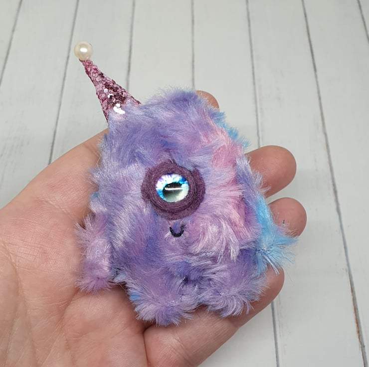 Soft Faux fur monster with one glass eye in felt surround. This little monster measures roughly 9cm tall and wears a hand sewn glitter hat with pearl on top. The smile is hand embroidered. The hat is sewn to the head and the monster comes with a transparent loop hanger.