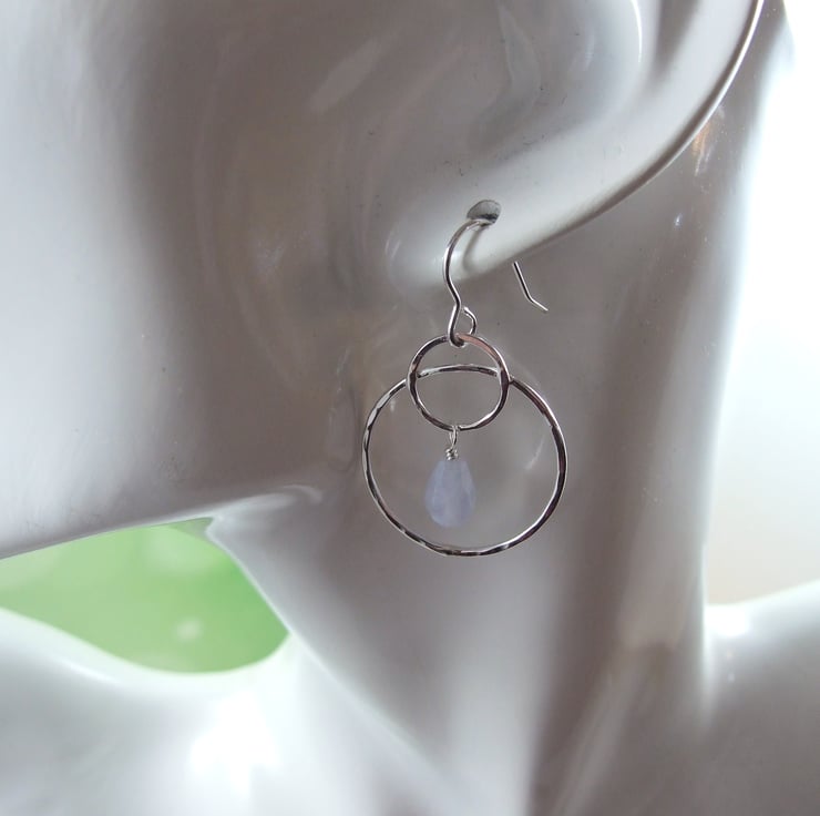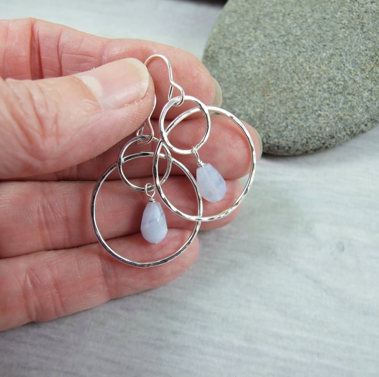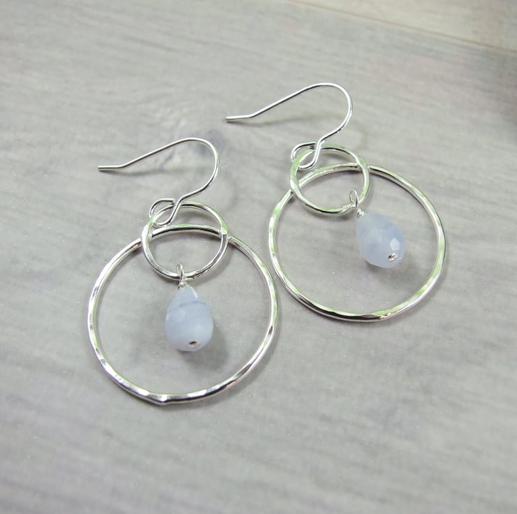 Sterling Silver Circle Earrings with Blue Lace Agate Gemstones. Silver Hoops with large and smaller sterling silver circles and pale blue gemstones.