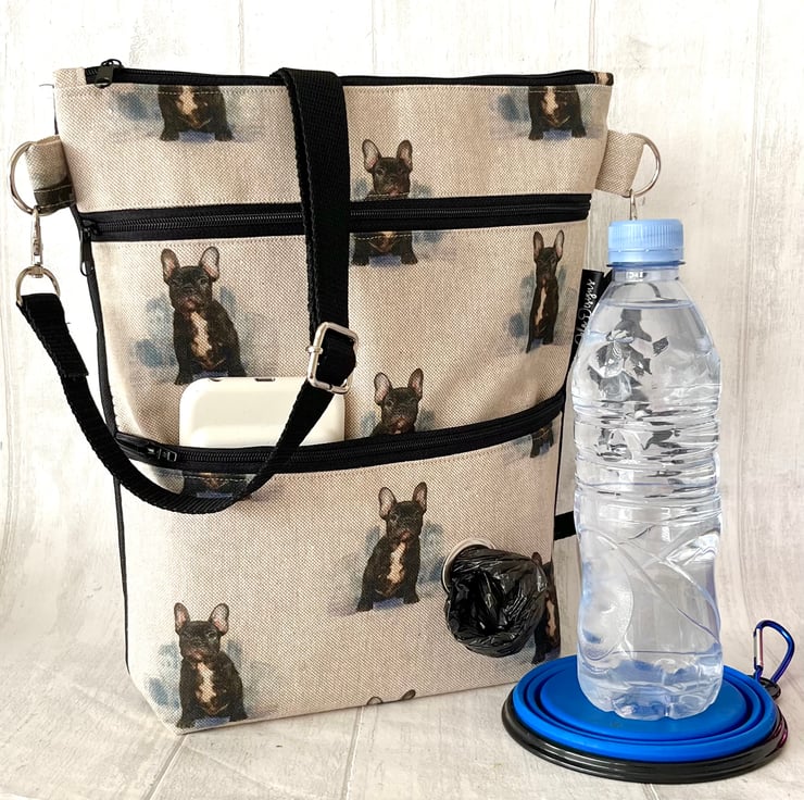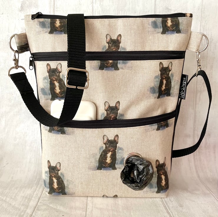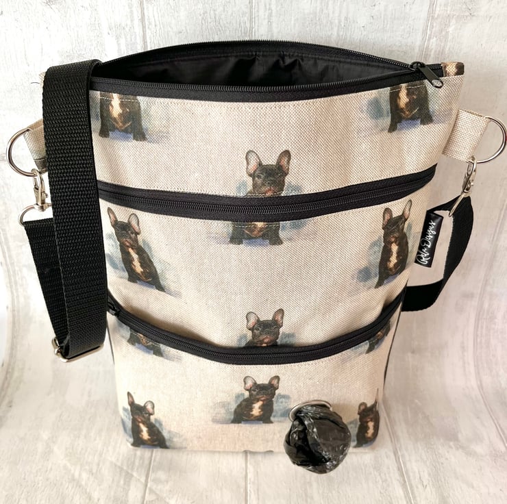 This Frenchie cotton, linen print cross body dog walking bag has a plain black waterproof nylon canvas back and is lined with a black waterproof nylon lining. This handy bag will hold all your essentials for walking your dog.