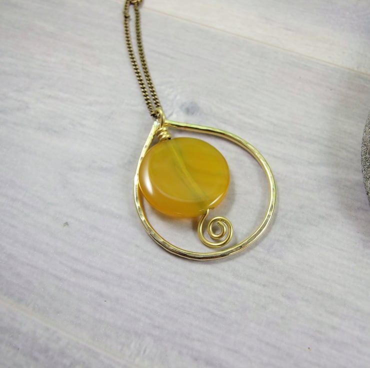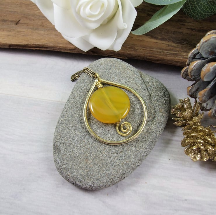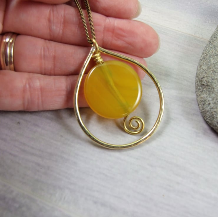 I have created the outer teardrop shape using brass wire, shaped, soldered and hammered for texture. Inside the teardrop I have wire wrapped a lovely dyed yellow agate gemstone. Wire wrapped with brass wire and secured with a spiral at the bottom. Brass chain has been added to hang the decoration.