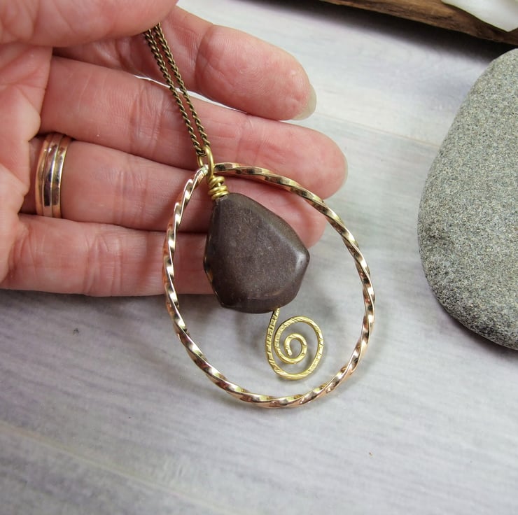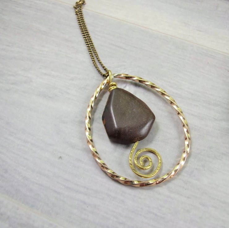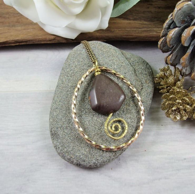 I have created the outer teardrop shape using brass wire, twisted to form a spiral then shaped and soldered. Inside the teardrop I have wire wrapped a lovely shaped jasper gemstone. Wire wrapped with brass wire and secured with a spiral at the bottom. Brass chain has been added to hang the decoration.