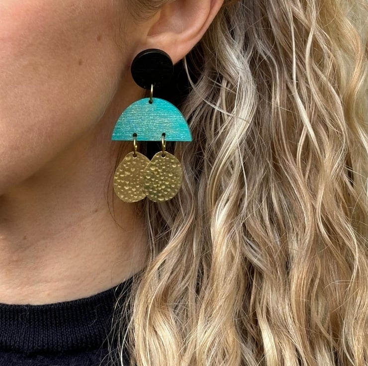 Earring posts are made from stainless steel and raw brass 6mm flat pad, so are good for sensitive ears. Rubber press backs.