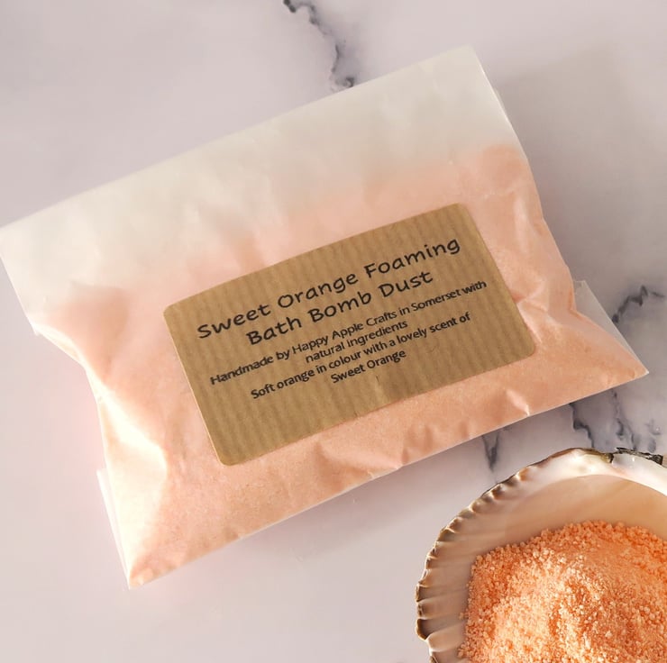This listing is for a 60g (approx) bag of foaming bath bomb dust, with a Sweet Orange scent.