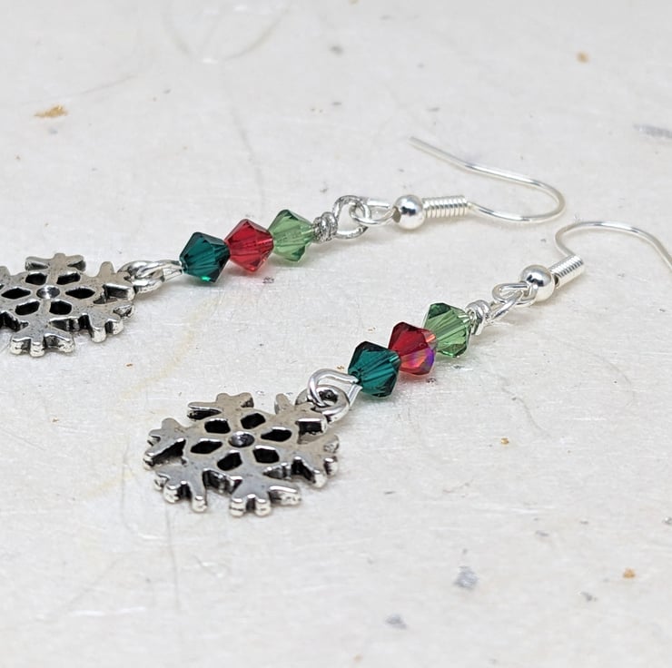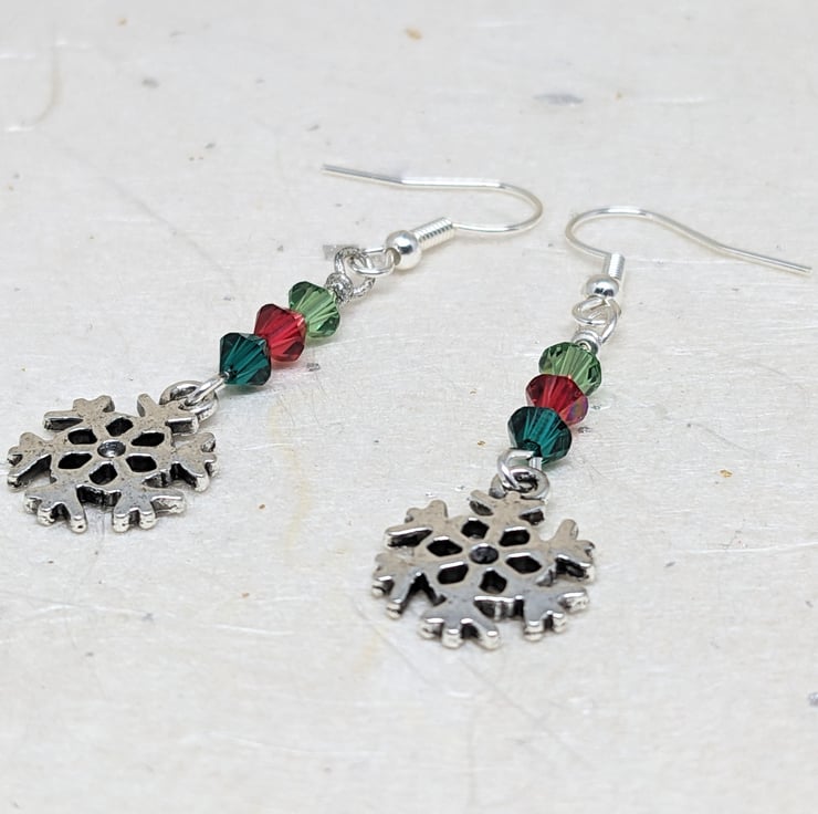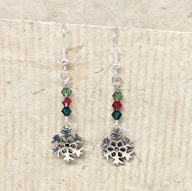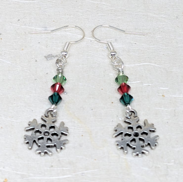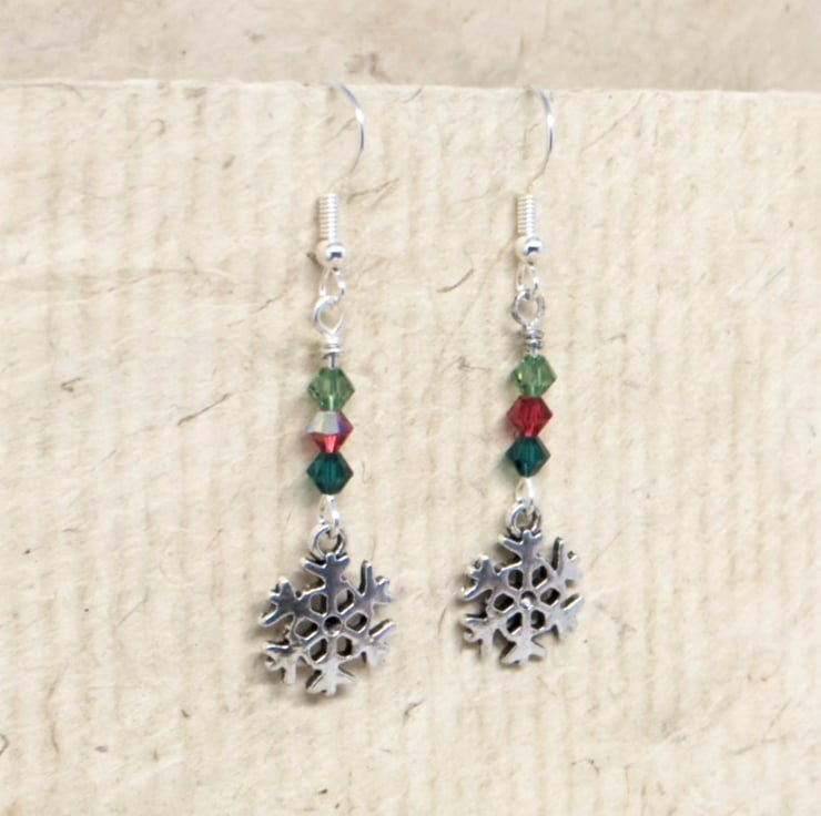 These lightweight earrings feature a trio of red and green genuine Swarovski crystals that sparkle when they catch the light. Small snowflake charms hang beneath them to give a wintry vibe. Simple silver plated fish hook ear wires complete them.