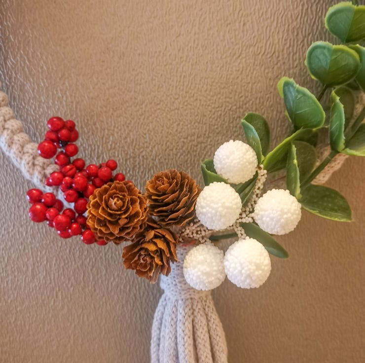 Accented with faux pine cones, red and white berries and two strands of eucalyptus leaf.