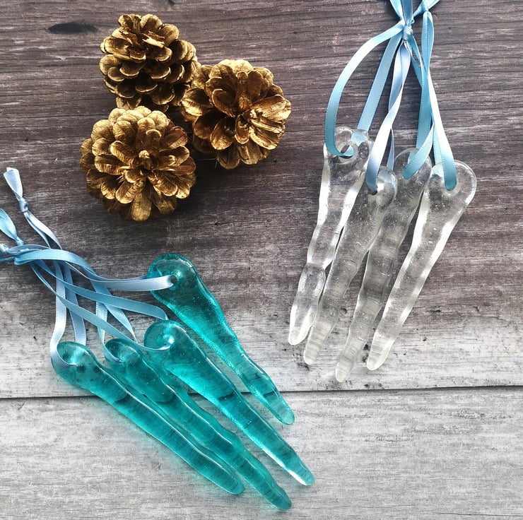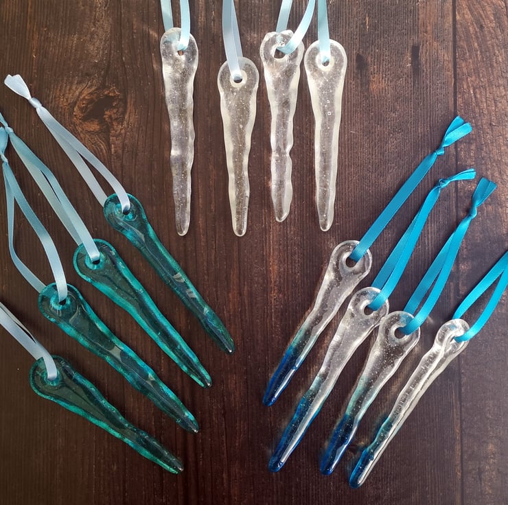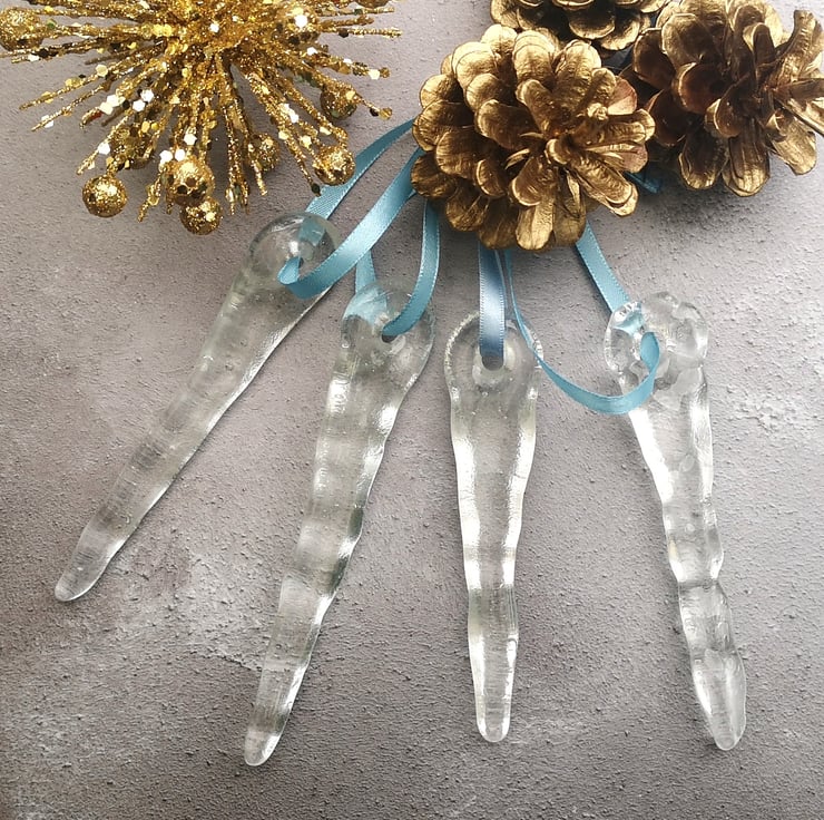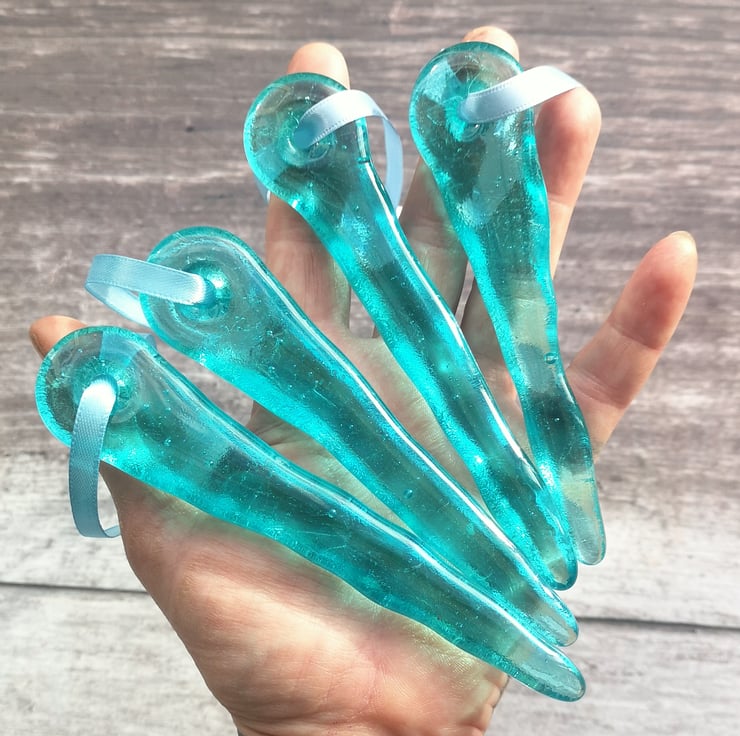 Set of 4 Icicle Hanging Decorations. Handmade from glass that has been fused in a kiln, using only fully tested & compatible best quality art glass.