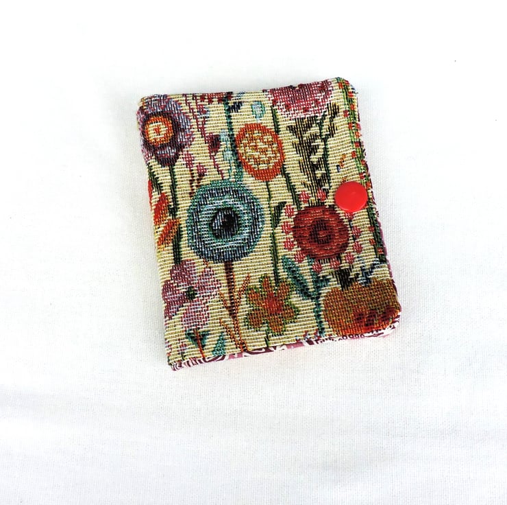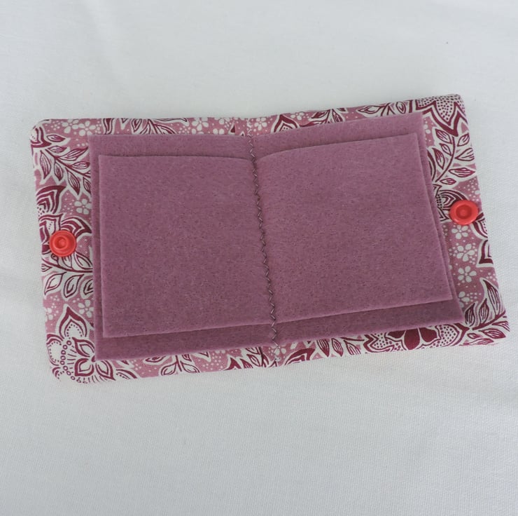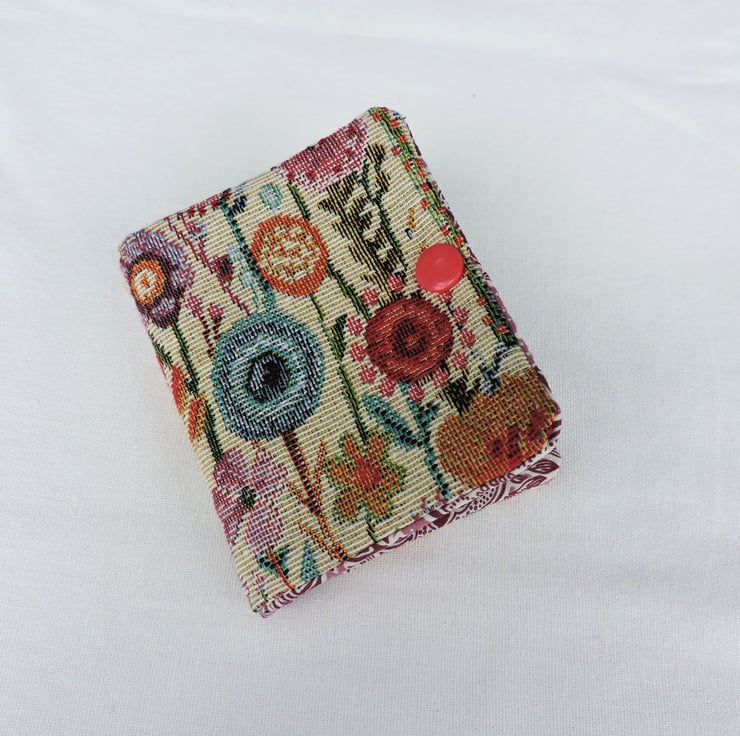 I've made this little sewing needle case from a pretty floral tapestry fabric. A lot of pretty colourful flowers on a cream background has been used for the outer of the case. The inner is a cotton Liberty fabric of white and pink flowers. It has four felt leaves in a dusky mauve and fastens with a little red Kam Snap stud.