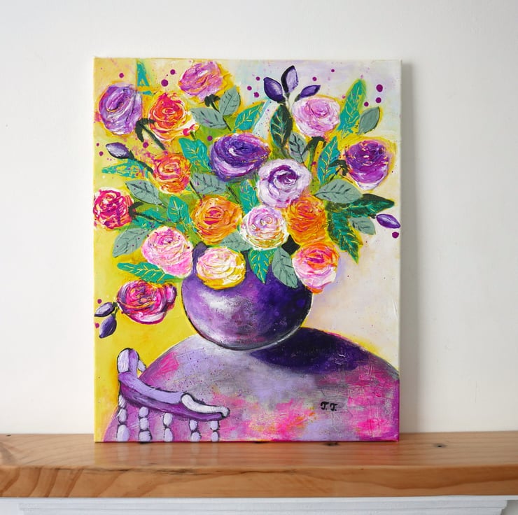 This modern artwork for your home decor is created in acrylic on canvas in an abstract expressionist style, featuring a bouquet of textured purple and pink roses against a yellow and purple background. Yellow and purple are complementary colours and I like using them together in my art. This purple rose painting measures approximately 16" x 20" x 1" , it is varnished for protection and ready to hang or frame to your taste. Please note that it does not need framing unless you prefer it framed.
