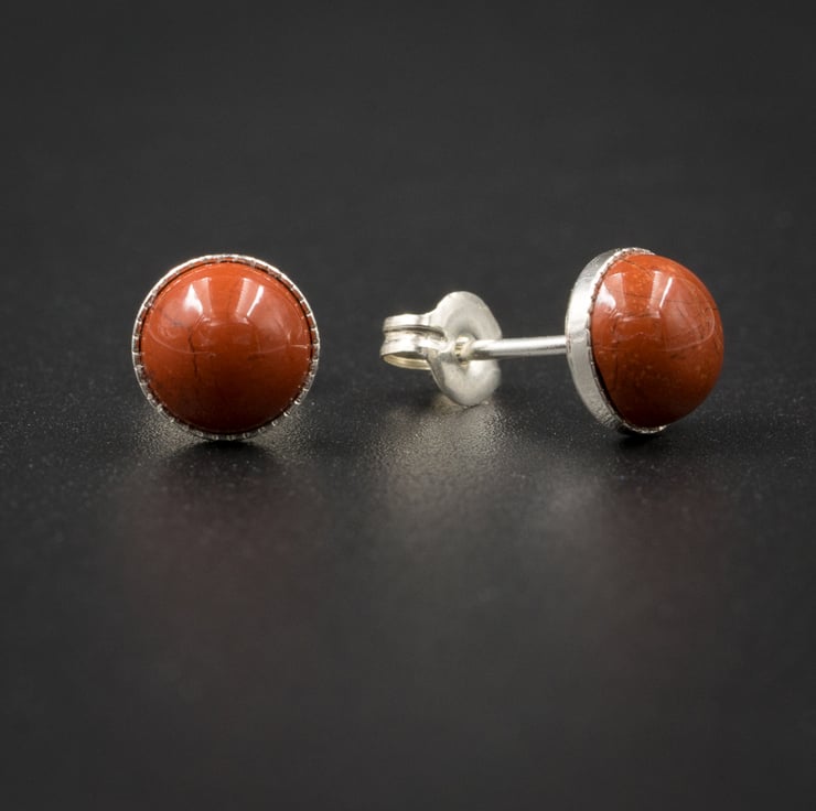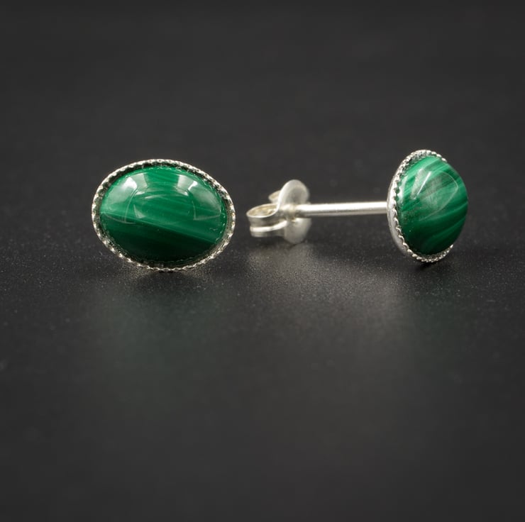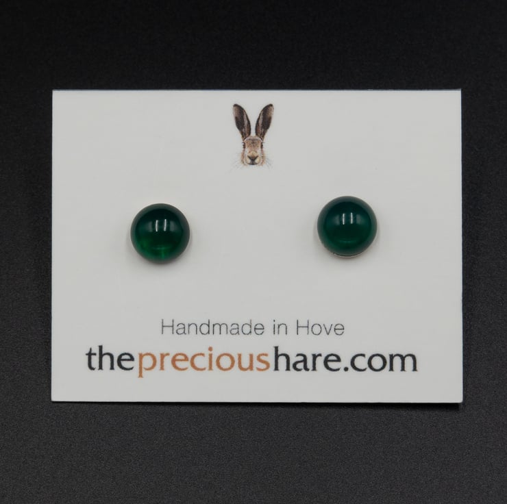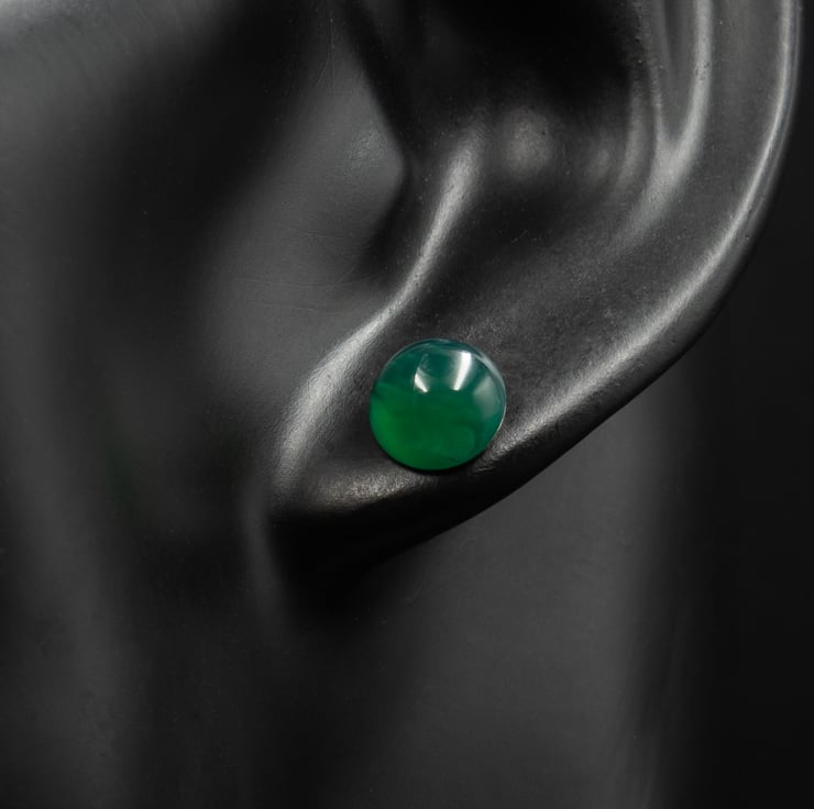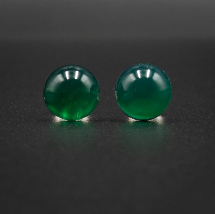 8mm round forest green onyx cabochon stones are mounted onto a solid sterling silver mount with a butterfly clip to secure. A lovely autumnal shade for any occasion.