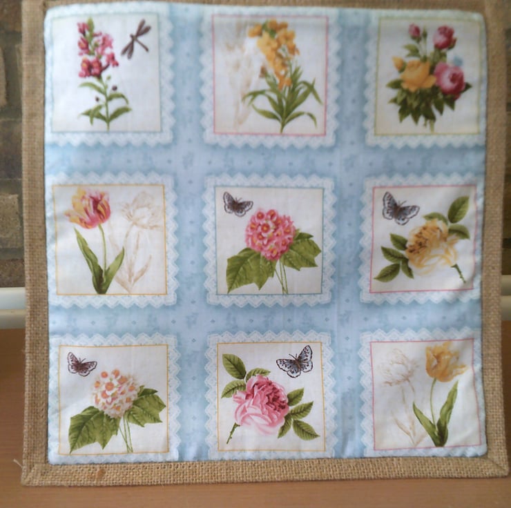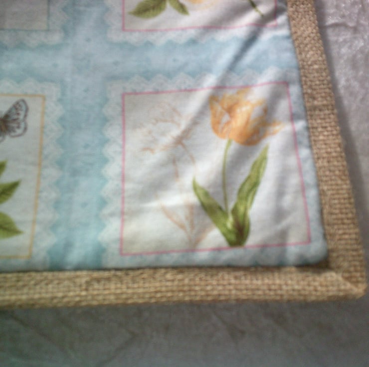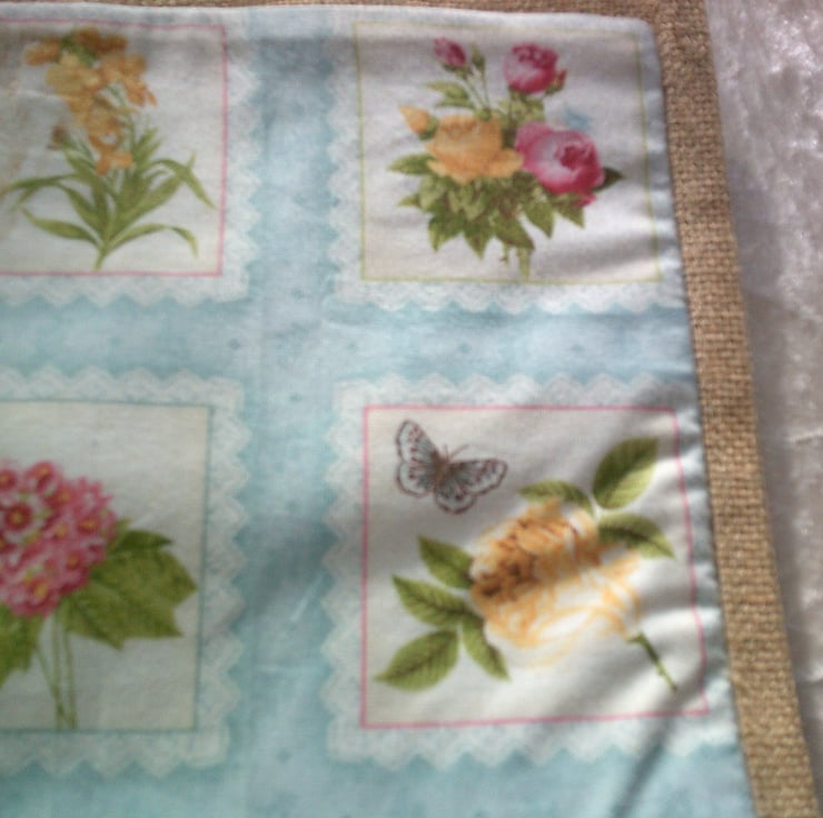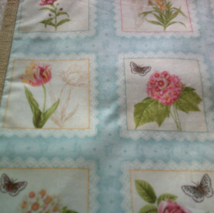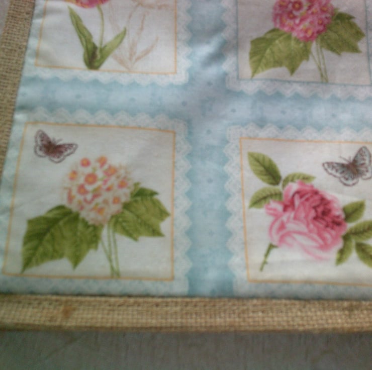 The bag itself measures approximately 30 x 30 x 20 cm (12 x 12 x 8 inches). The fabric pocket - which has been hand sewn onto the bag is a panel featuring 9 different pictures of flowers and butterflies on a white background with a blue border
