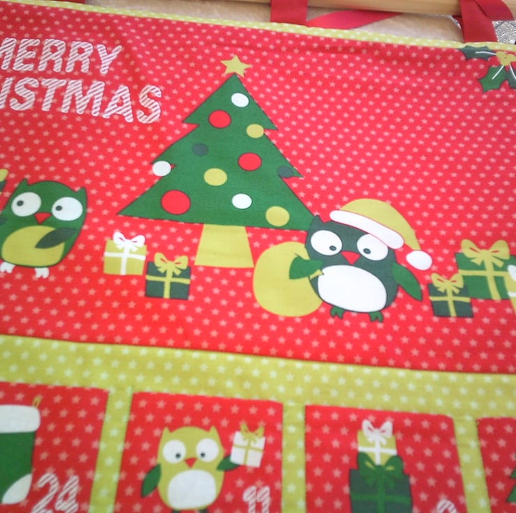The design is of owls and Christmas trees on a red background. The pockets have holly, stockings, wreaths, bells and trees.