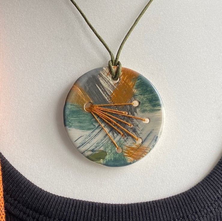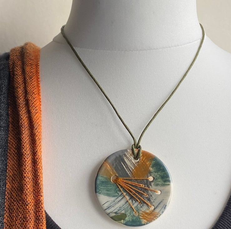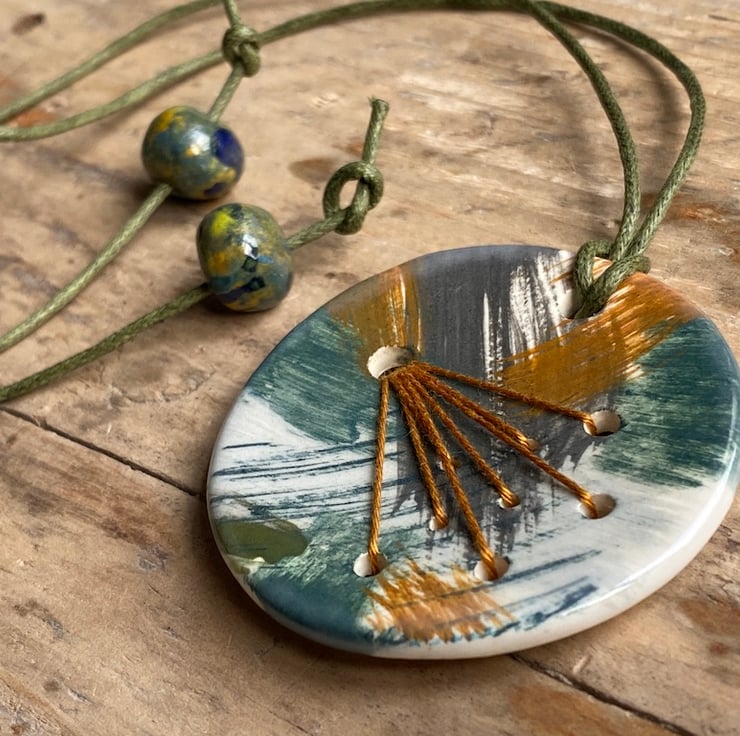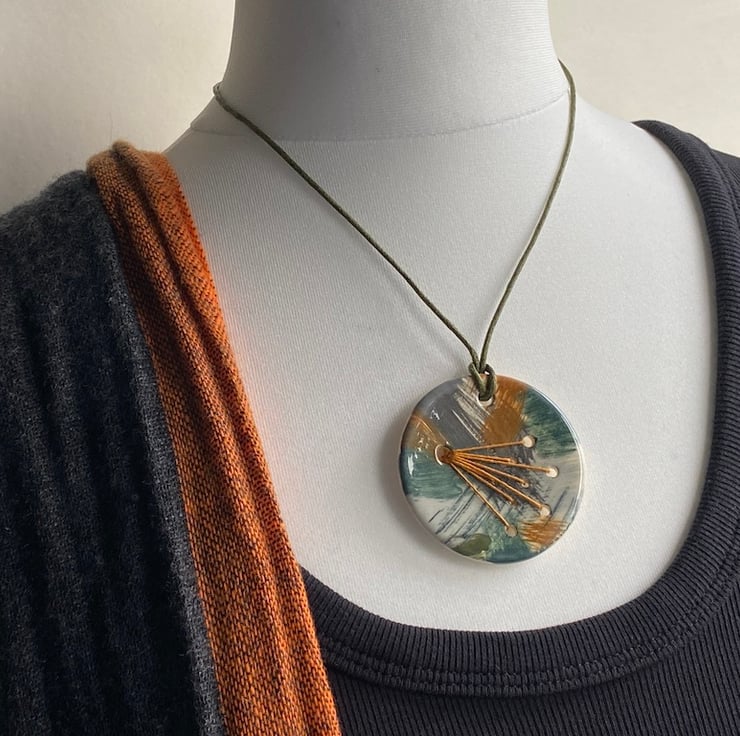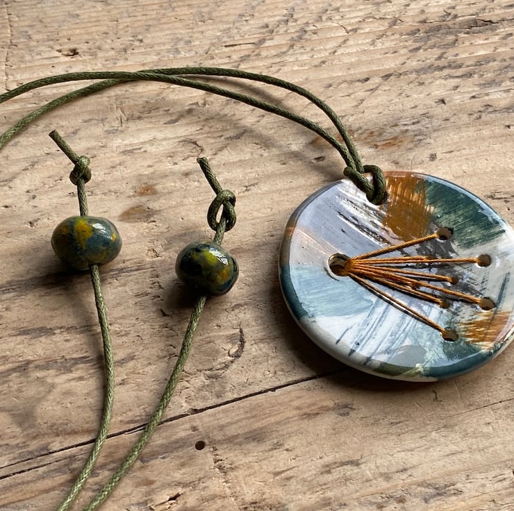 The pendant is hung on a generous 24-inch khaki green waxed cord and finished with handmade beads, ensuring it's both eye-catching and comfortable to wear.