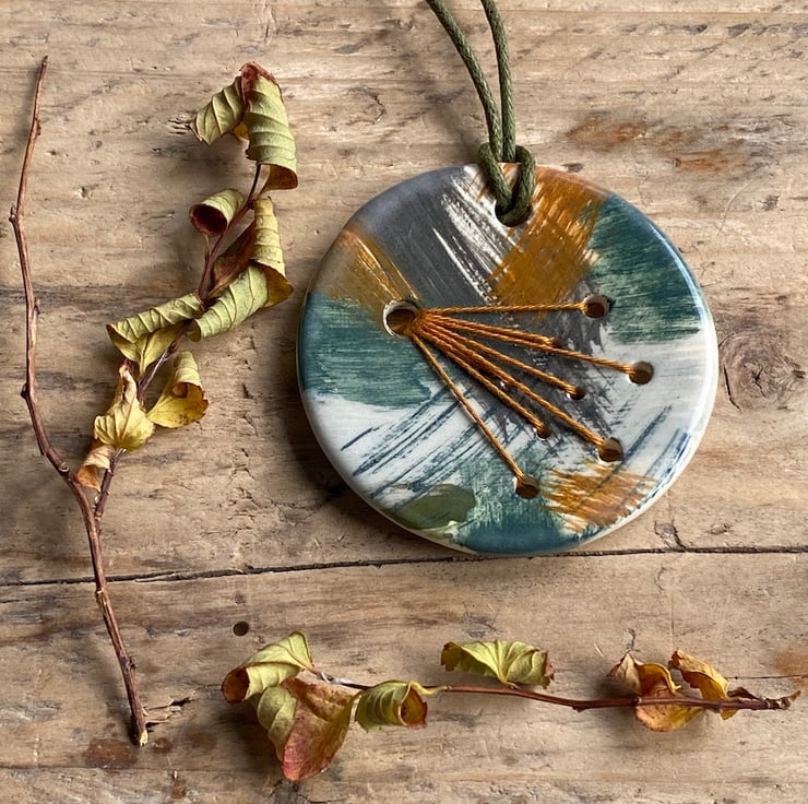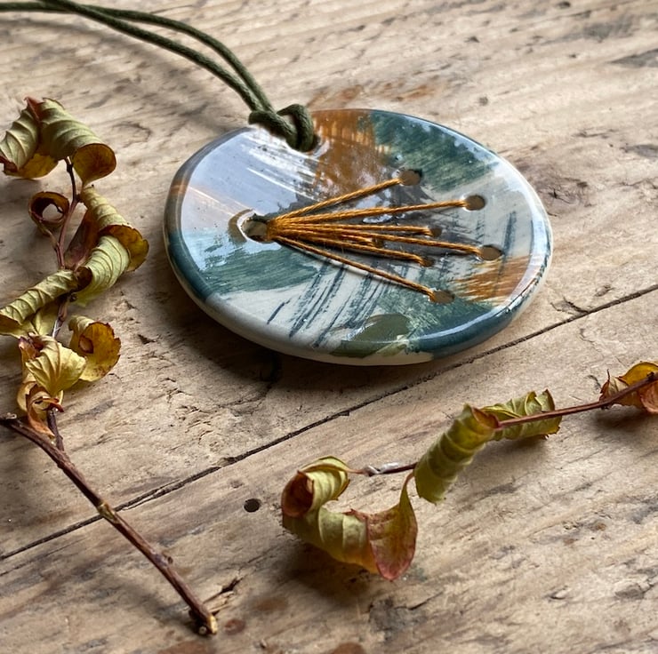 This unique piece is meticulously hand crafted, featuring a rich autumnal glazes of Greens and browns and intricate Orange embroidery threads, making it a perfect choice for the Autumn season.