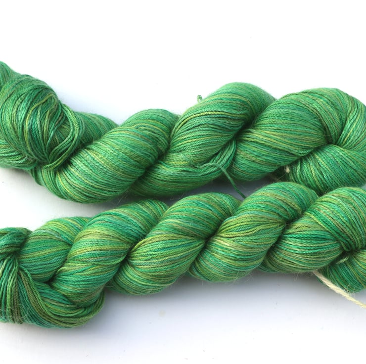 Light, fresh spring, lime and emerald greens. This beautiful, luxurious yarn has the softness and warmth of alpaca with the smooth sheen and cool feel of silk. This is the 4-ply/sock weight equivalent of the my bestselling silky baby alpaca laceweight, and combines the softness and luxury of the baby alpaca/silk blend with the versatility of 'sock' yarn. There are two skeins available (price shown is for one). Photographs have been taken and edited in bright natural light.