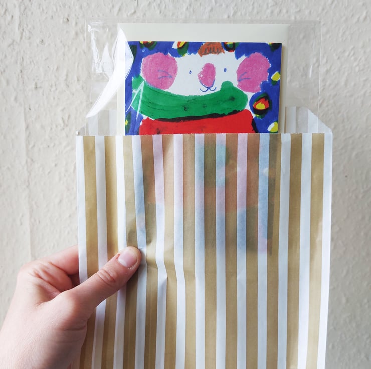 Comes with a cream envelope a paper gift bag and biodegradable sleeve.
