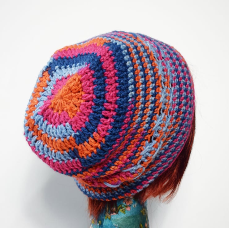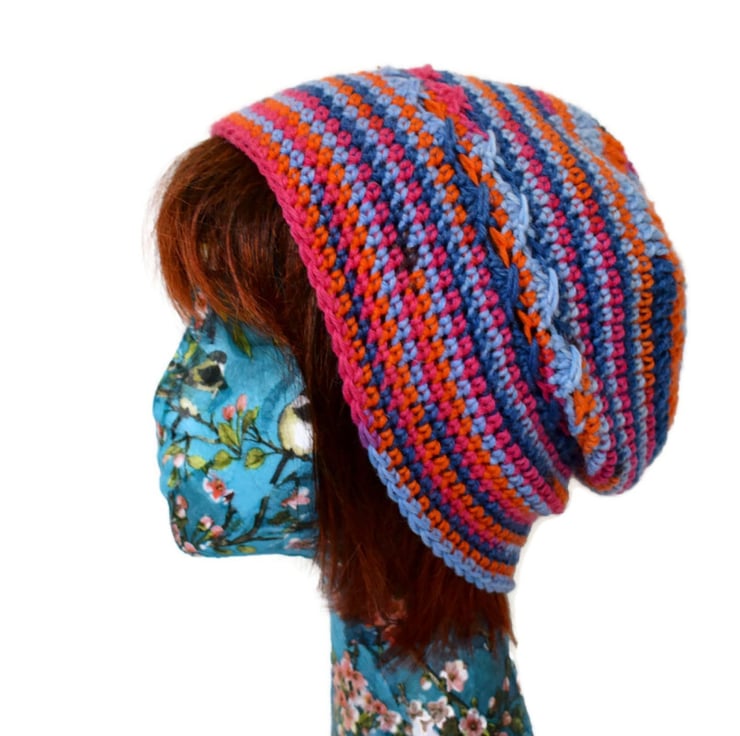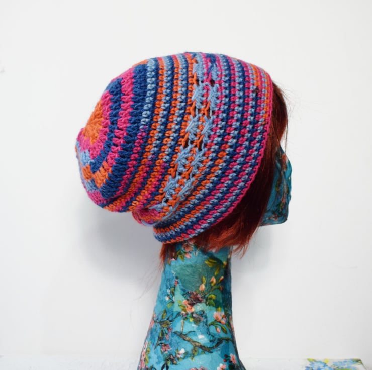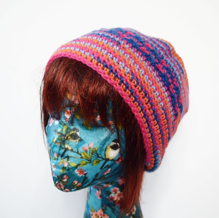 I have crocheted this hat in a great self patterning wool yarn in shades of pink, blue and orange. Unstretched the bottom is approx 20" but it will easily stretch out a few more inches. From top to bottom it is 9 inches so you can wear it with the bottom turned up for a closer skull cap type fit or with it left down for a slouchier fit.