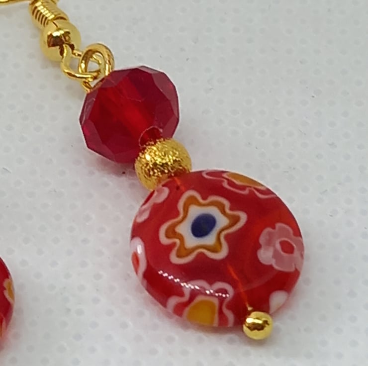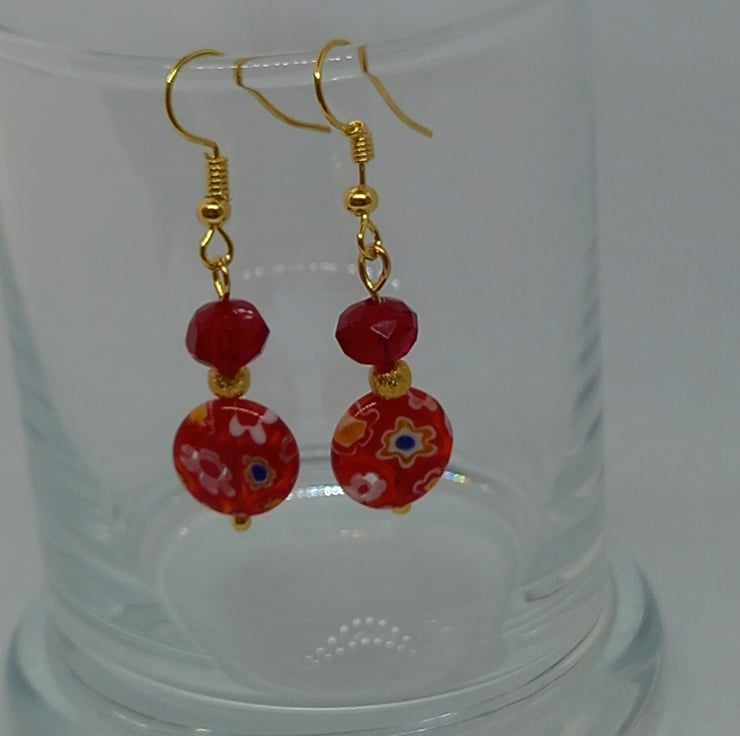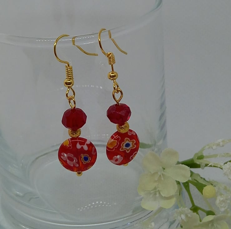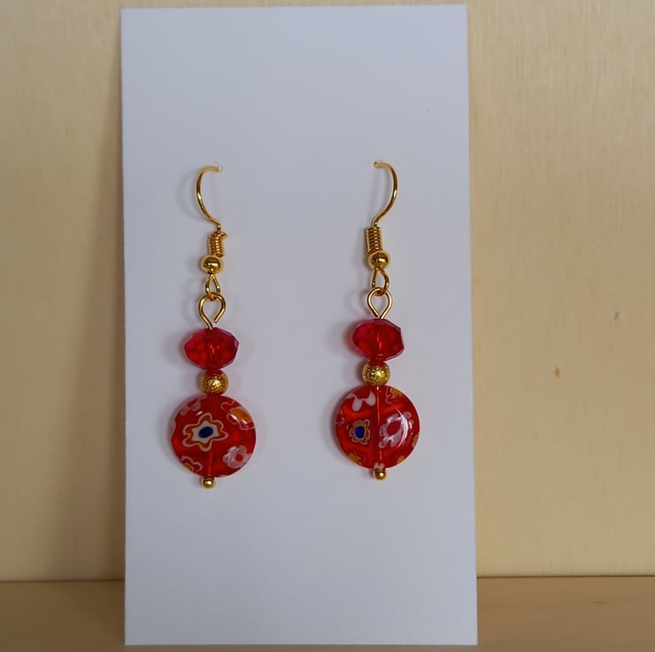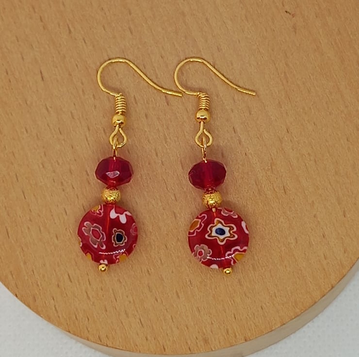 Beautiful red millefiori circle beads are used here with red crystal rondelles and gold stardust spacer beads to make these very jolly earrings. The beads are threaded onto gold plated head pins, finished with a simple loop at the top and suspended from gold plated ear hooks.