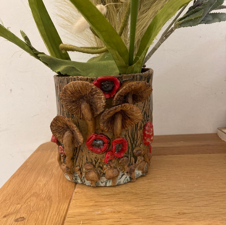 Crafted with care by skilled artisans, this ceramic planter features a raised toadstool design with vibrant poppies to create a truly eye-catching piece. The intricate details and beautiful colours make it a one-of-a-kind addition to any collection.