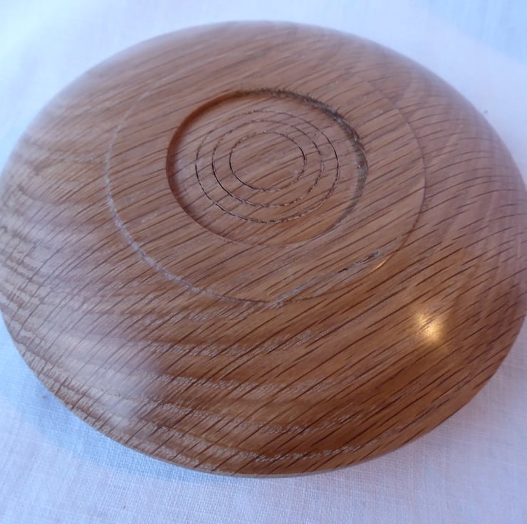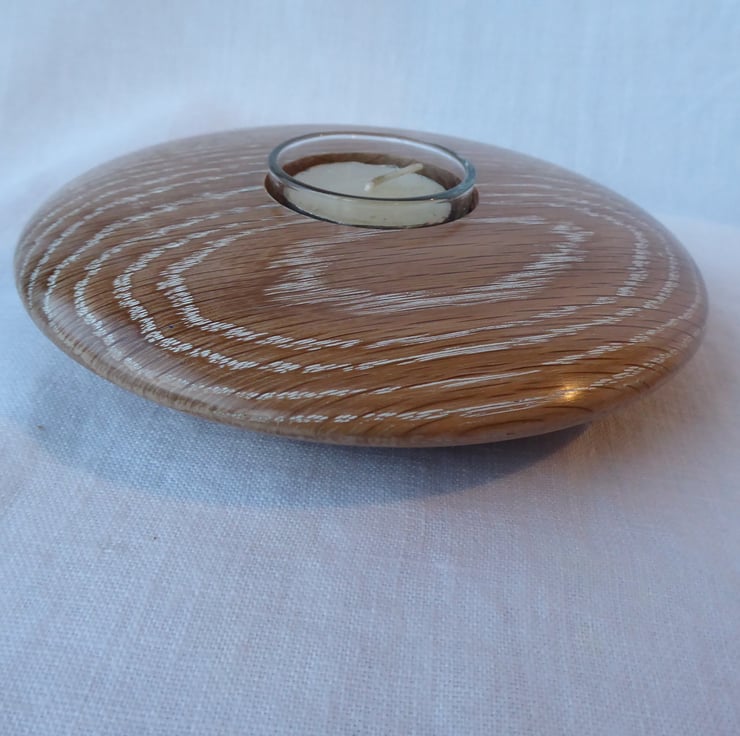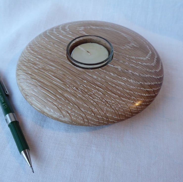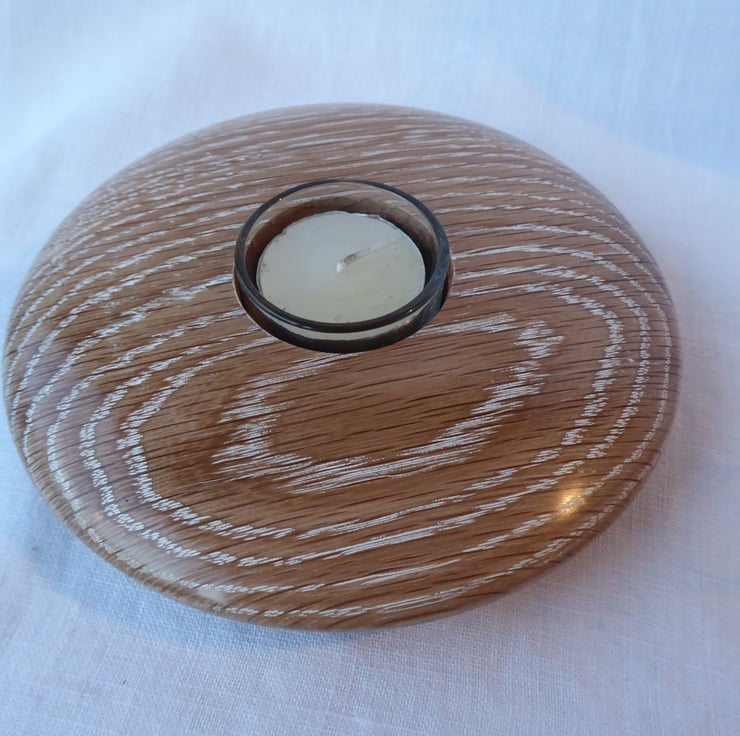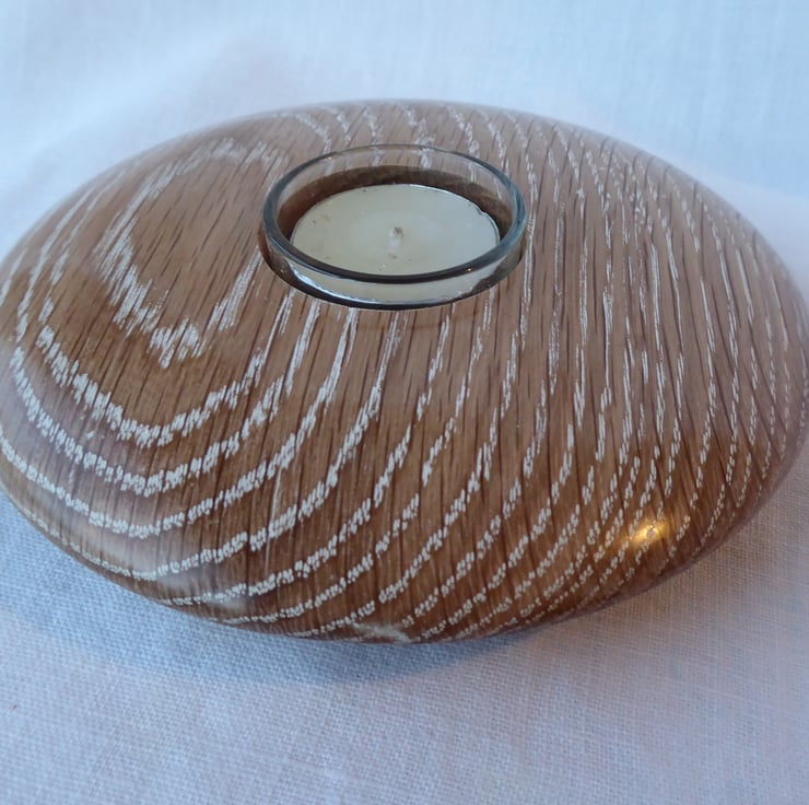 Oak Tea-light holder turned in English Oak (Quercus Robur) then decorated with Liming Wax to highlight the grain of the wood.