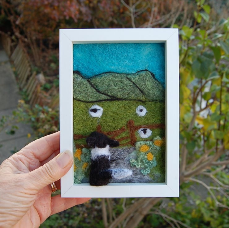 A needle felt landscape of the Yorkshire Dales. In the foreground a sheepdog sits, watching the sheep in a nearby field.