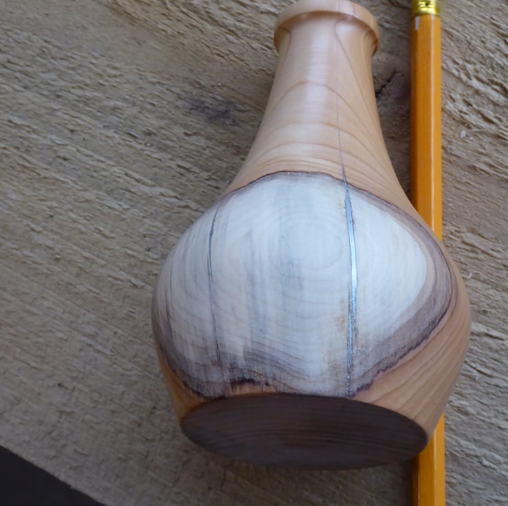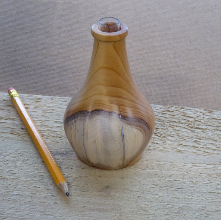 This is a Bud Vase or to our American friends a Twig Pot. Made from English Yew (Taxus Baccata)...Although the wood was well seasoned, a split occured shortly after turning. This has been repaired with an aluminium "Weld"