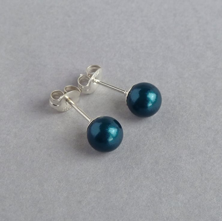 6mm Teal Pearl Stud Earrings - Small Round Petrol Blue Glass Pearl Studs - Gifts