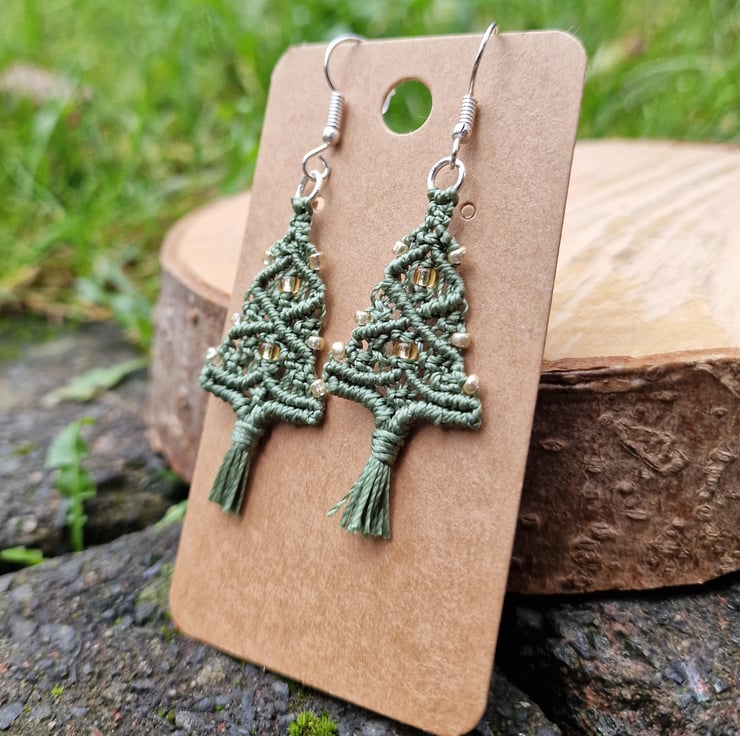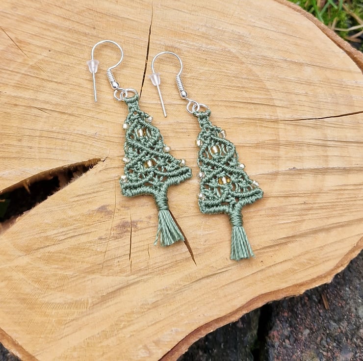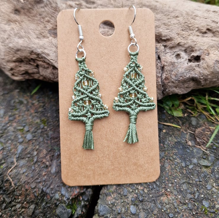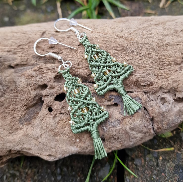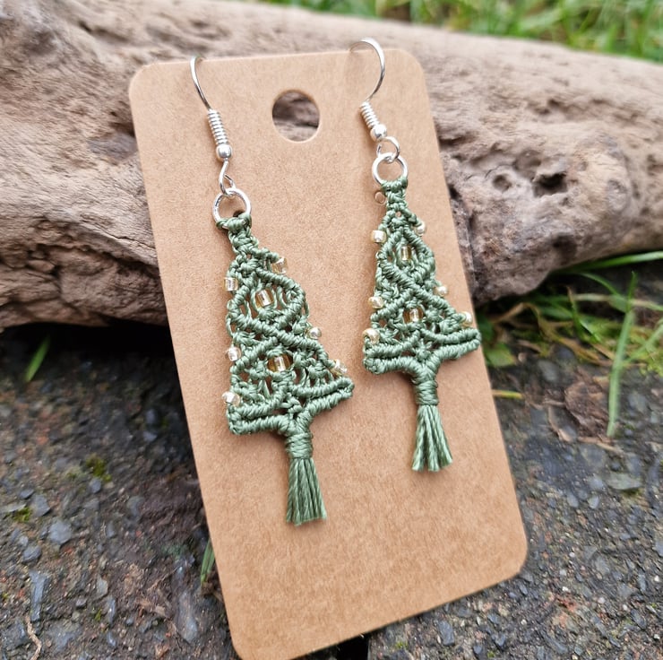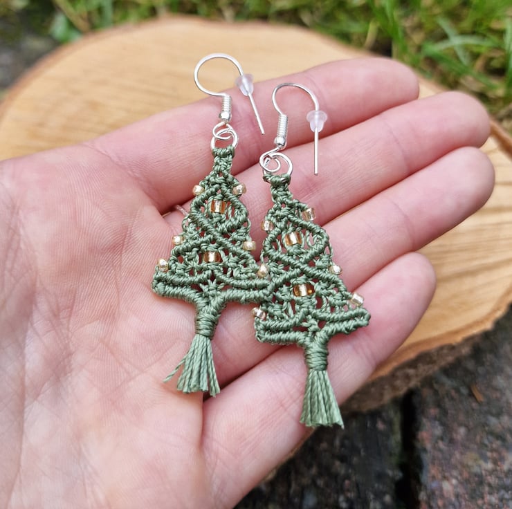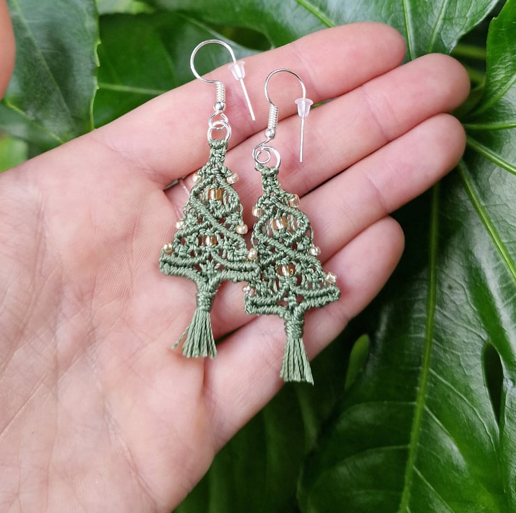 Add a touch of glimmer to your Christmas outfit with our unique handmade Macrame tree earrings in a sage green colour. The boho earrings holds small gold seed beads around the edges to replicate baubles. The beads with in the center are glass seed beads.