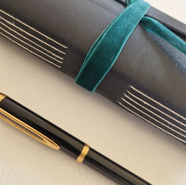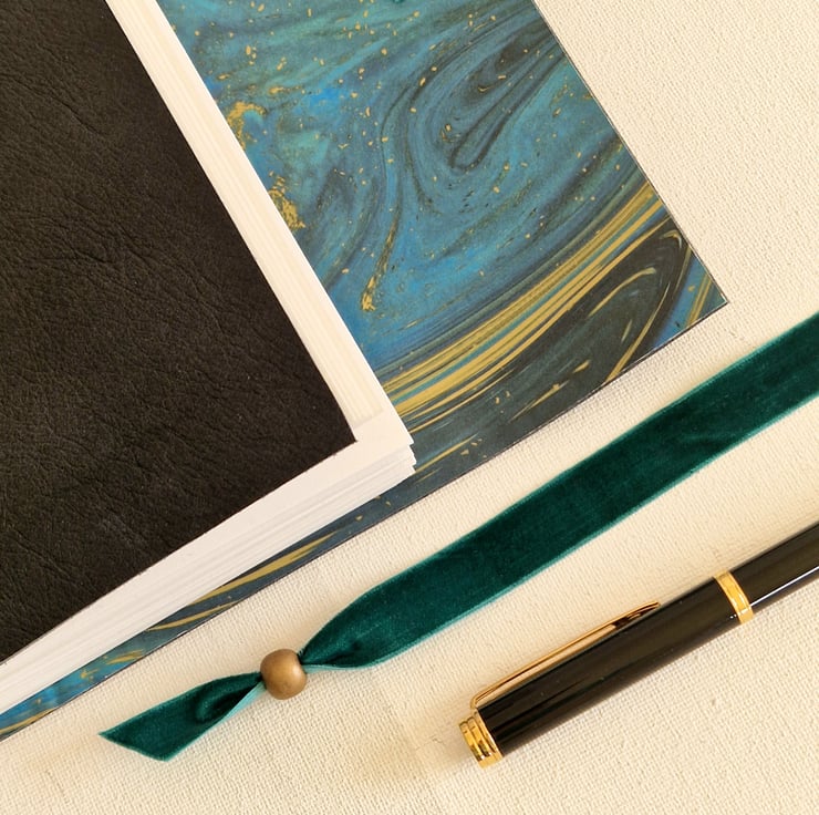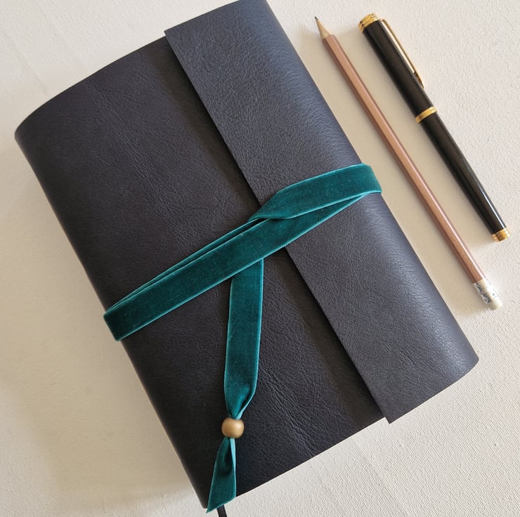 The Journal is closed with a turquoise velvet ribbon wrapped around and finished with a gold wooden bead.