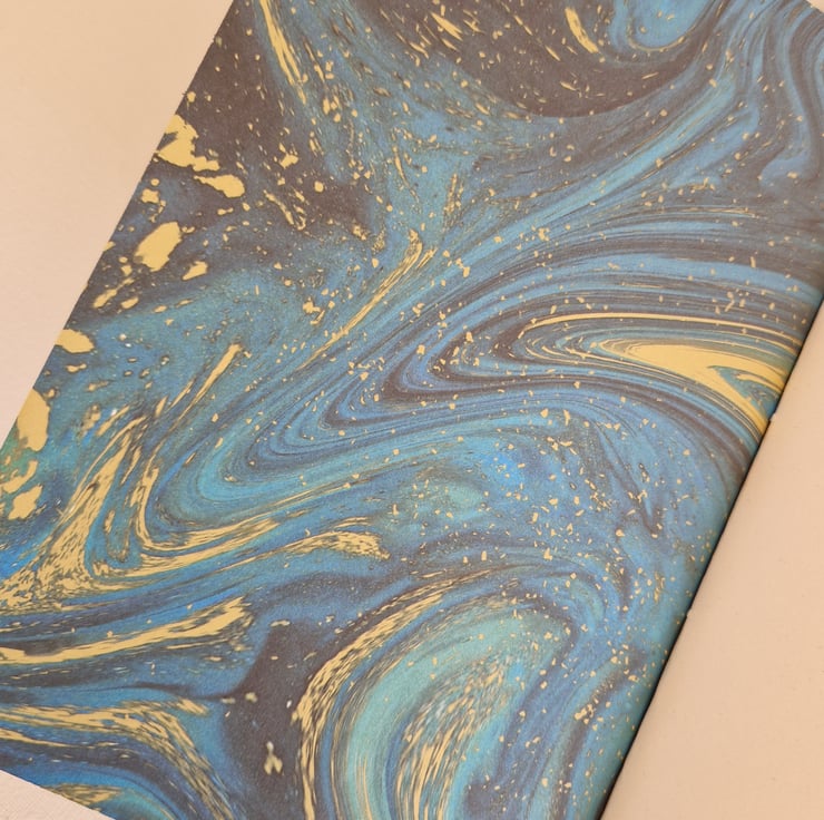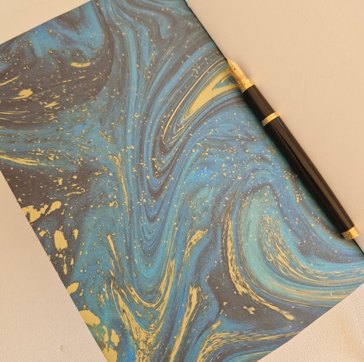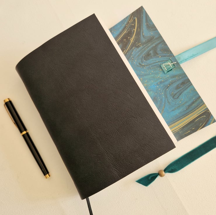 Beautiful Black Leather Journal with sumptuous Turquoise and Gold Marble Paper lining the Covers. Could be Aurora, Northern Lights, Milky Way or the Night Sky! Great gift for a writer, artist, daily journaling etc.