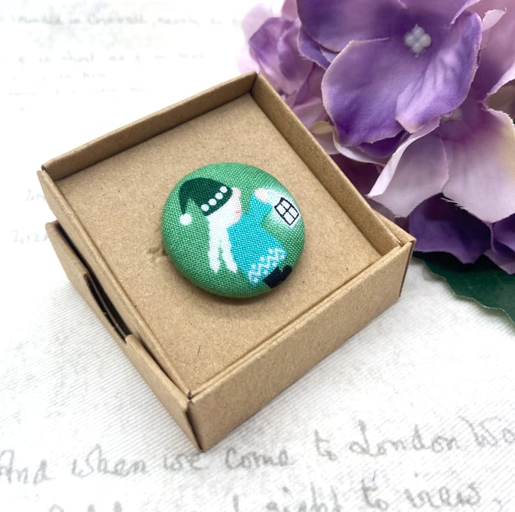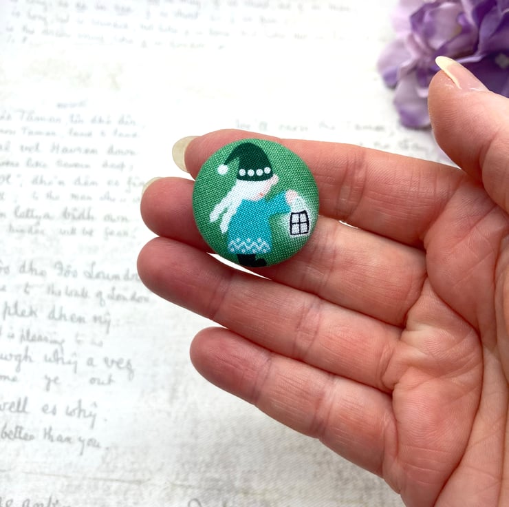 I've fashioned a 28mm fabric-covered, flat-backed button showcasing this darling gnome and added some toy filling for a delightful dome effect. Then, I secured a larch plywood wooden disc to the back of the button, letting the wood's natural grain shine through by sealing it with microcrystalline wax.