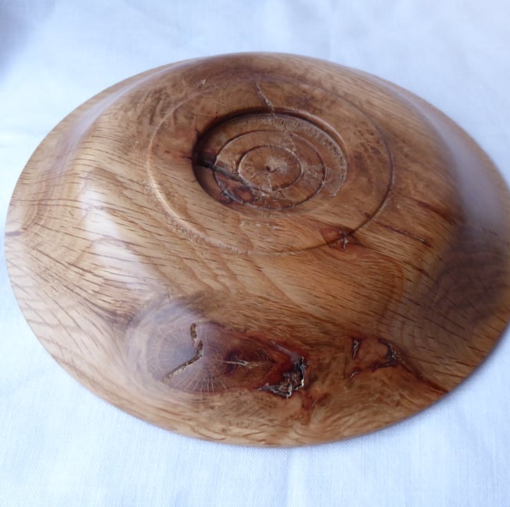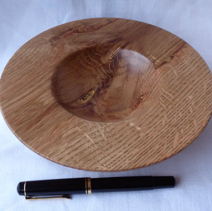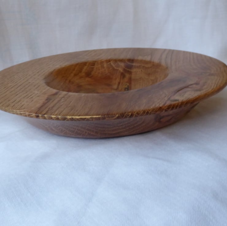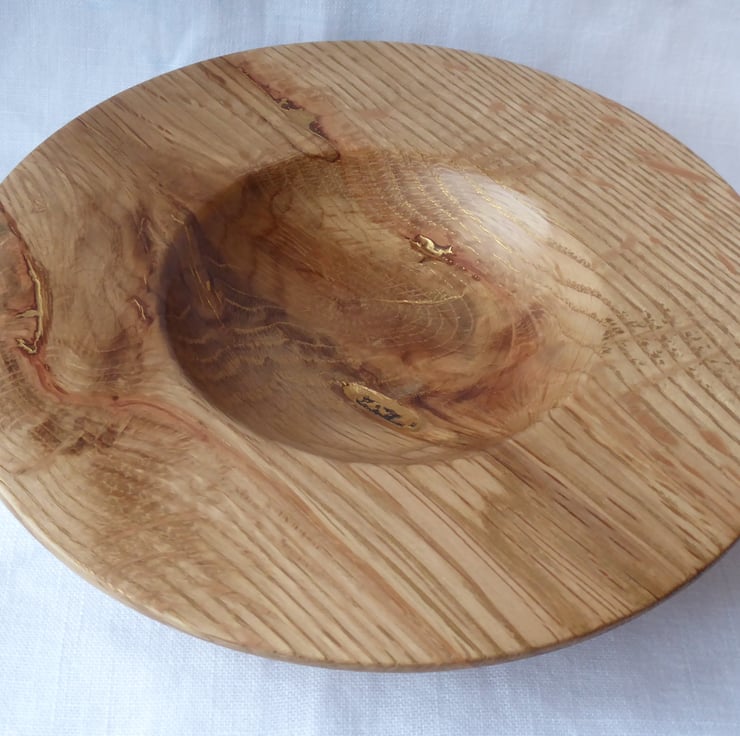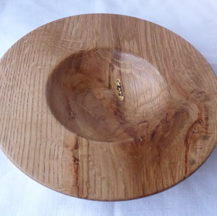A Trinket tray or Pin dish made from a piece of Oak Burr. The Grain and Flaws have been highlighted with a gold wax - That doesn't show up very well on the photographs.