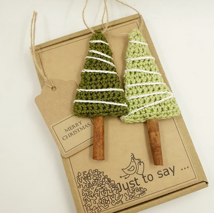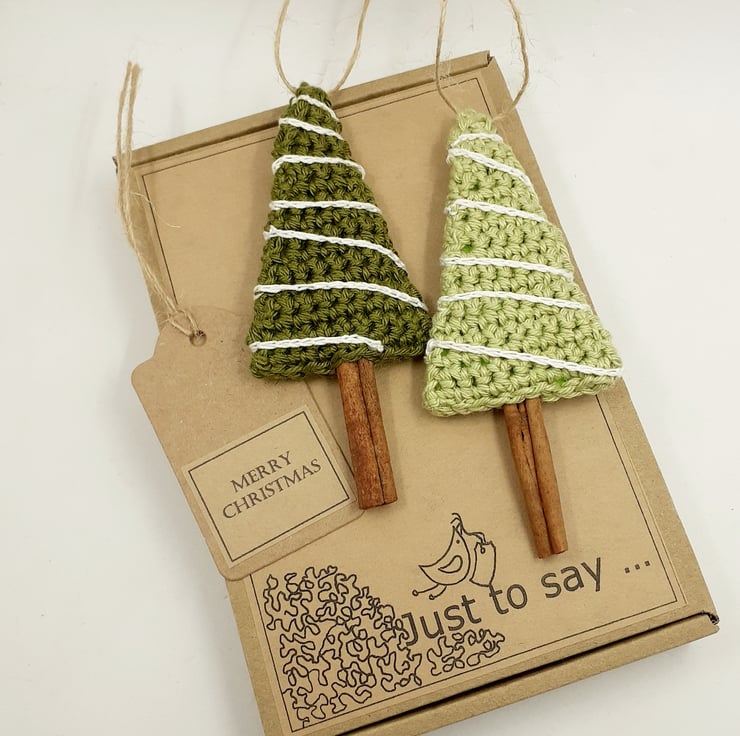 These rustic style fir tree decorations are crocheted in cotton and lined with stiffened felt. They have cinnamon sticks for trunks and a fine jute hanging loop. Each tree measures approximately 12.5 cm tall and comes wrapped in tissue in a labelled PIP ( Postage in Proportion) box, all ready to be given or posted on. There is a tag included in the box, which reads Merry Christmas although I am very happy to exchange this tag for one with wording of your choice. This would would make a novel alternative to a greetings card this year and a lovely tree decoration for many years to come.