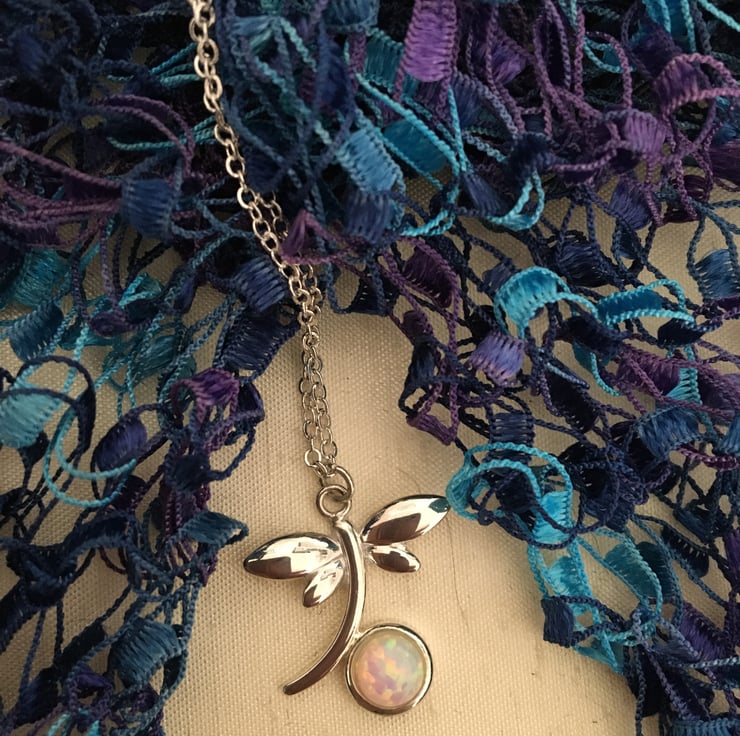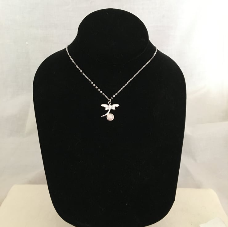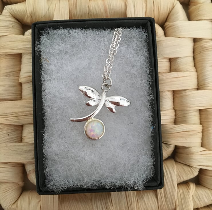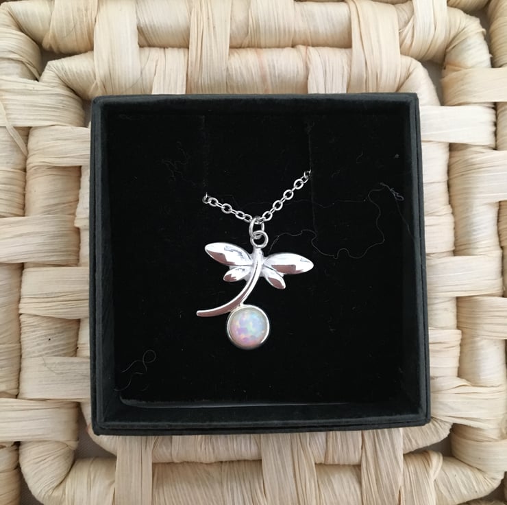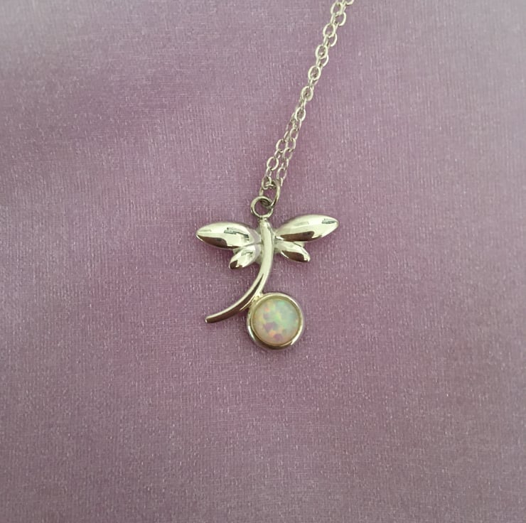 Very pretty dragonfly pendant with a faux opal centrepiece.